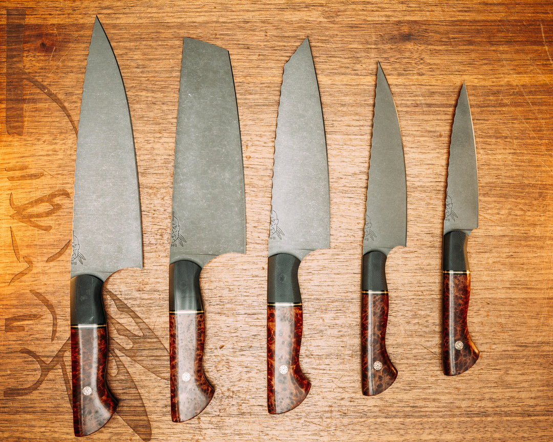 5 PieceChef Set- Black G10, Black G10 and Brass Split, Redwood Burl, Mosaic Pins, Smooth Grip