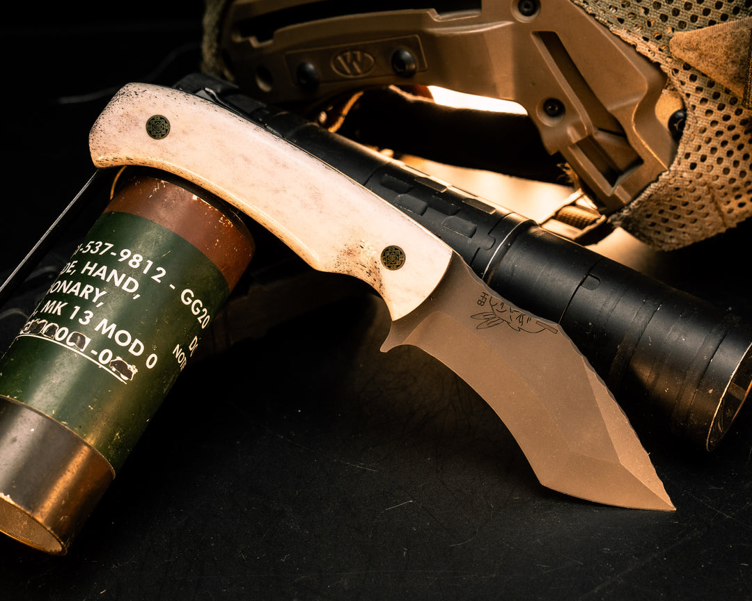 Buteo - Giraffe Bone, Black G10 and Copper Pin Striping, Copper Dark Matter Carbon, Desert Ironwood, Mosaic Pins, Contoured Grip