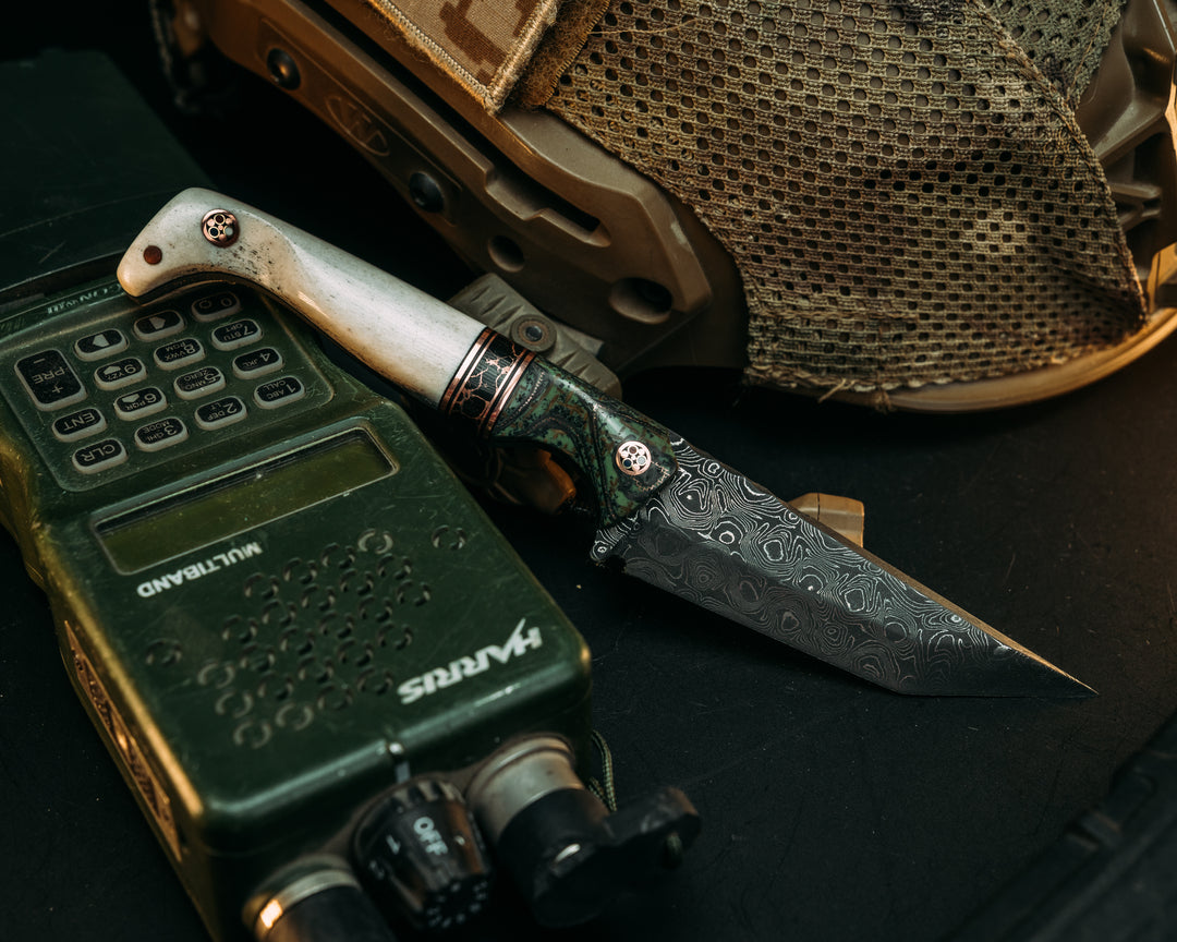 SHAW SHIV x HFB - Baker Forge Matrix Damascus- HBurlap, Green Resin, Copper Mesh and Carbon, Black G10 and Copper Pin Striping, Black with Copper Web Tru-stone Split, Patriot Mosaic Pins, Contoured Grip