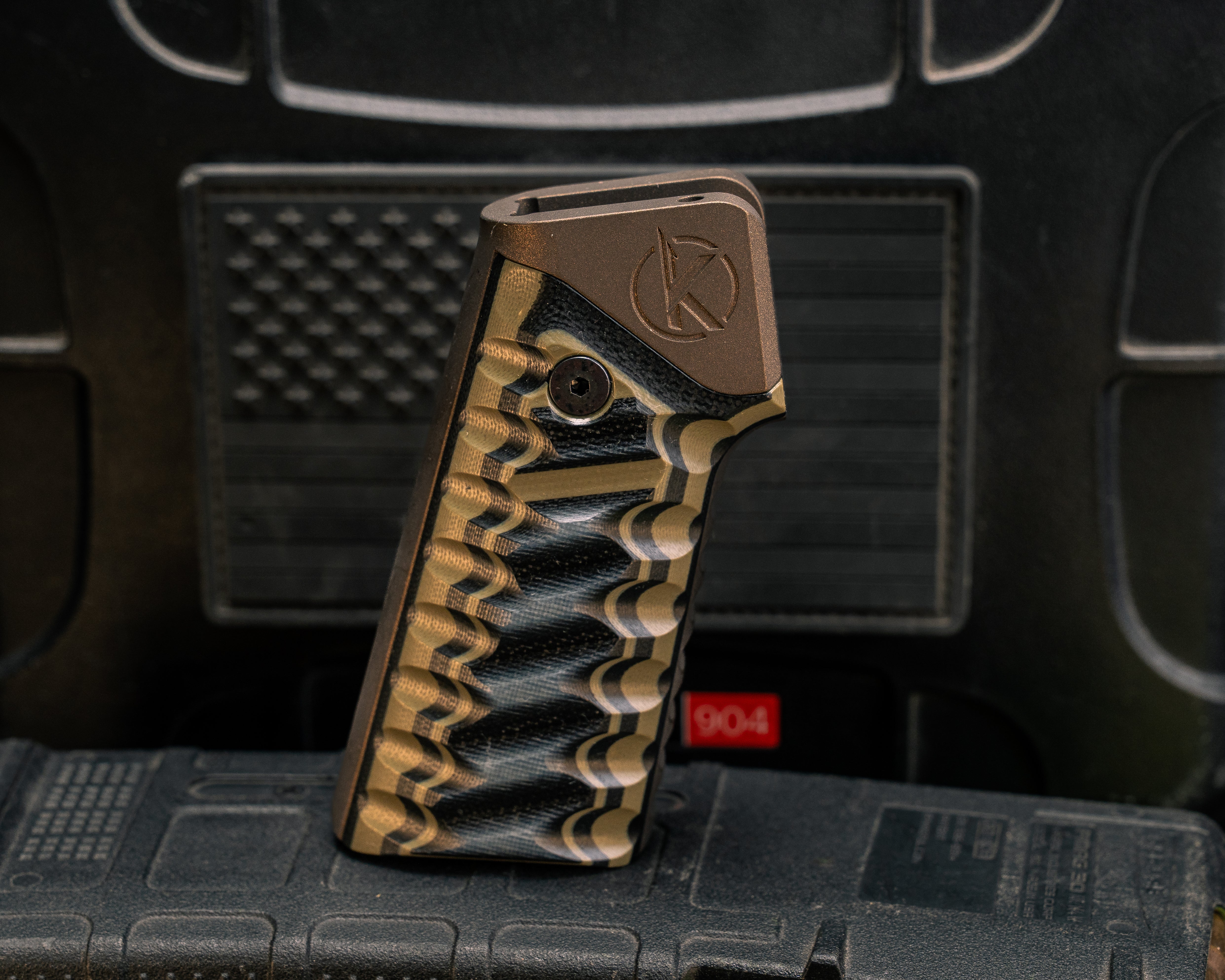 • Grip Base: This drop consists of a 1911 Grip Angle base that allows for firm control and a more relaxed grip position. Precision-machined from aerospace-grade aluminum, the base offers unmatched strength and durability without unnecessary weight. Designed to withstand the harshest environments—from saltwater spray to rugged backcountry terrain—this foundation ensures a secure and dependable grip for any application. Our Grips can be either Type 2 or 3 anodized or Cerakoted in various colors and patterns.