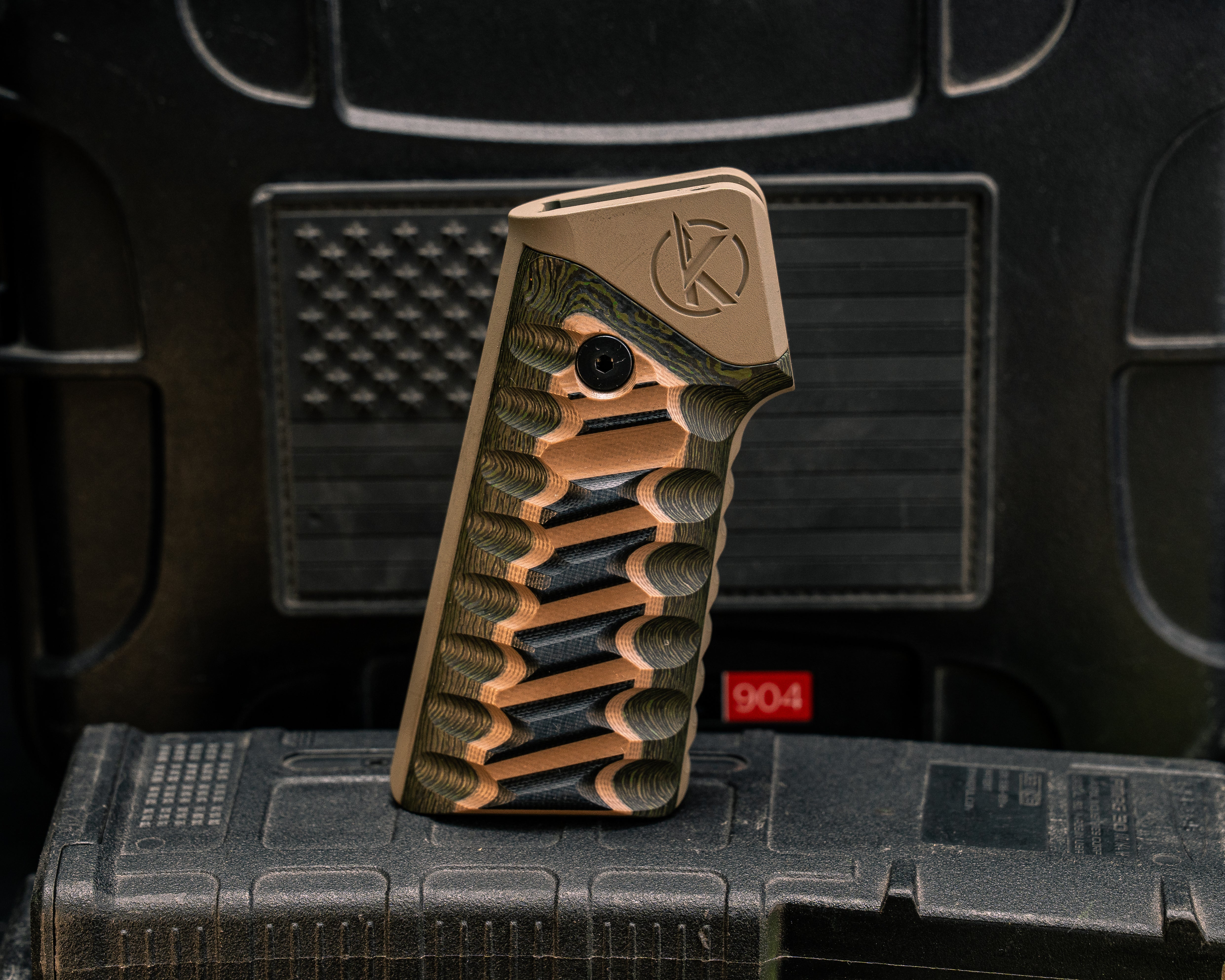• Grip Base: This drop consists of a 1911 Grip Angle base that allows for firm control and a more relaxed grip position. Precision-machined from aerospace-grade aluminum, the base offers unmatched strength and durability without unnecessary weight. Designed to withstand the harshest environments—from saltwater spray to rugged backcountry terrain—this foundation ensures a secure and dependable grip for any application. Our Grips can be either Type 2 or 3 anodized or Cerakoted in various colors and patterns.