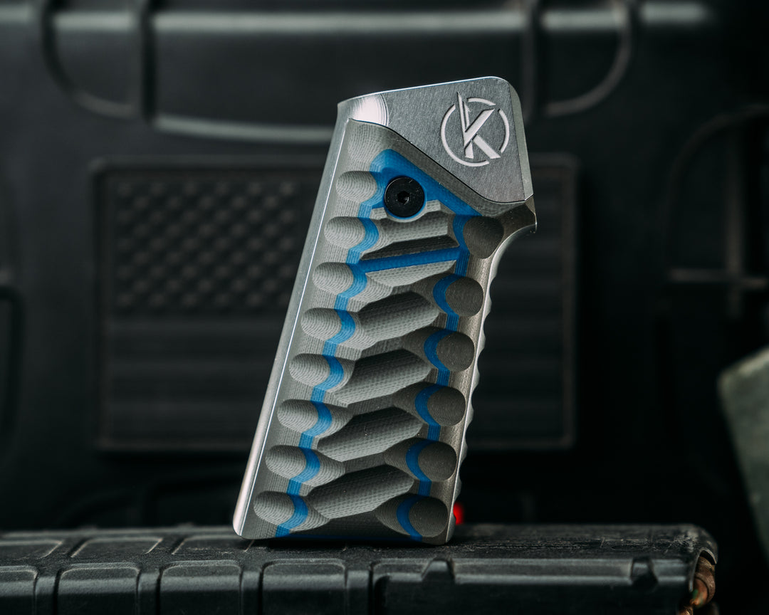 HFB x Kinetic AR Grip System - Gray & Blue G10, Clear Anodization, Snake Grip.
