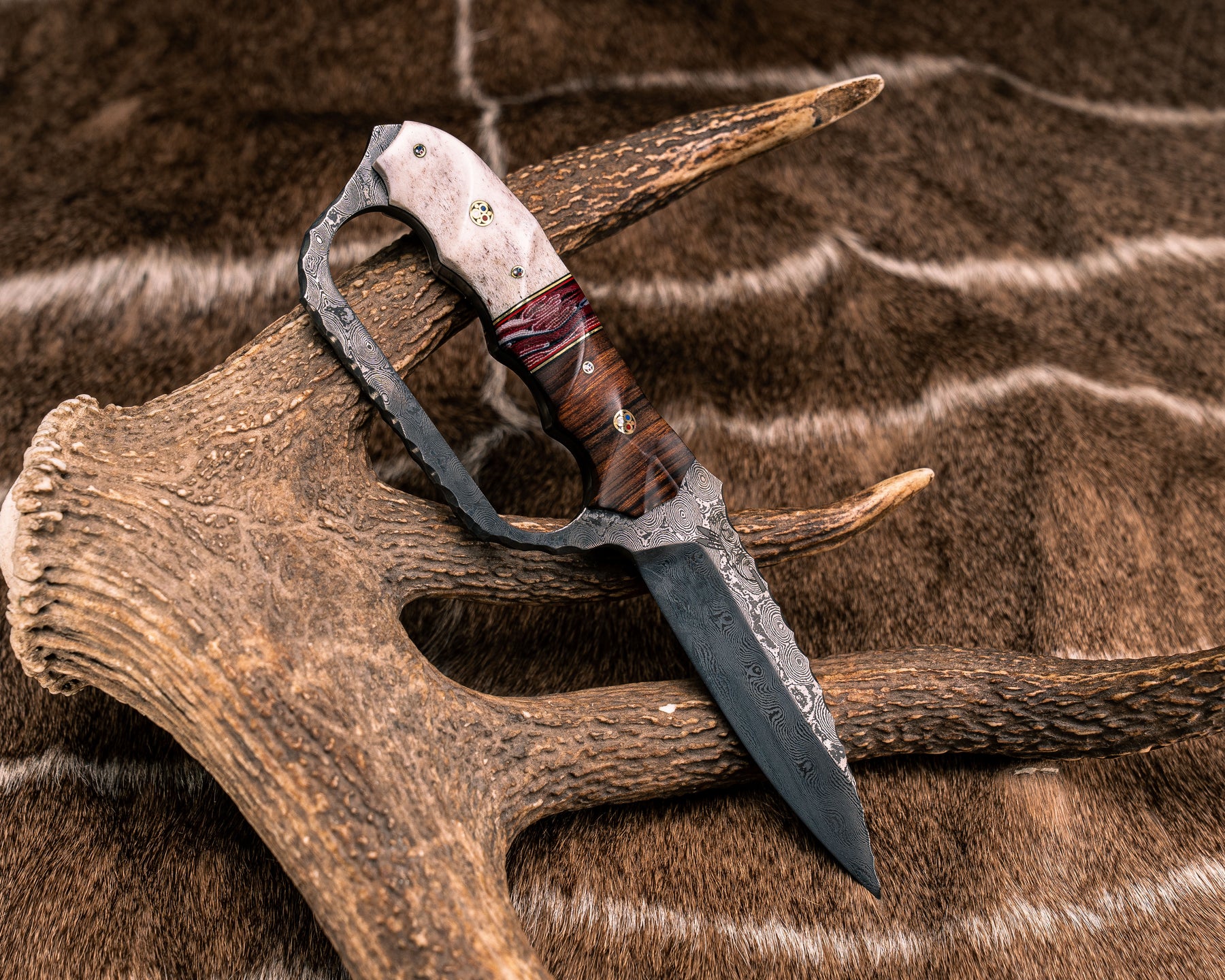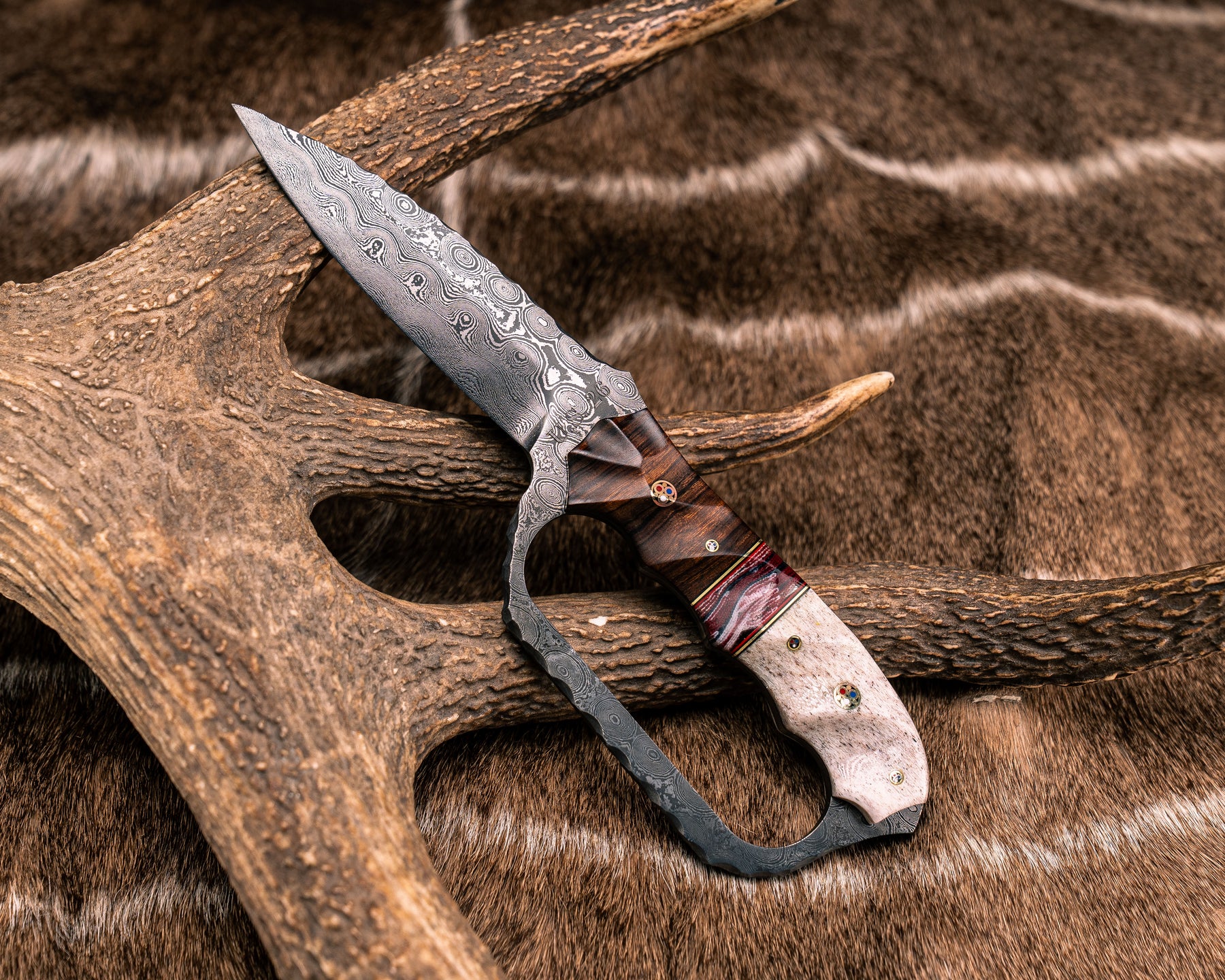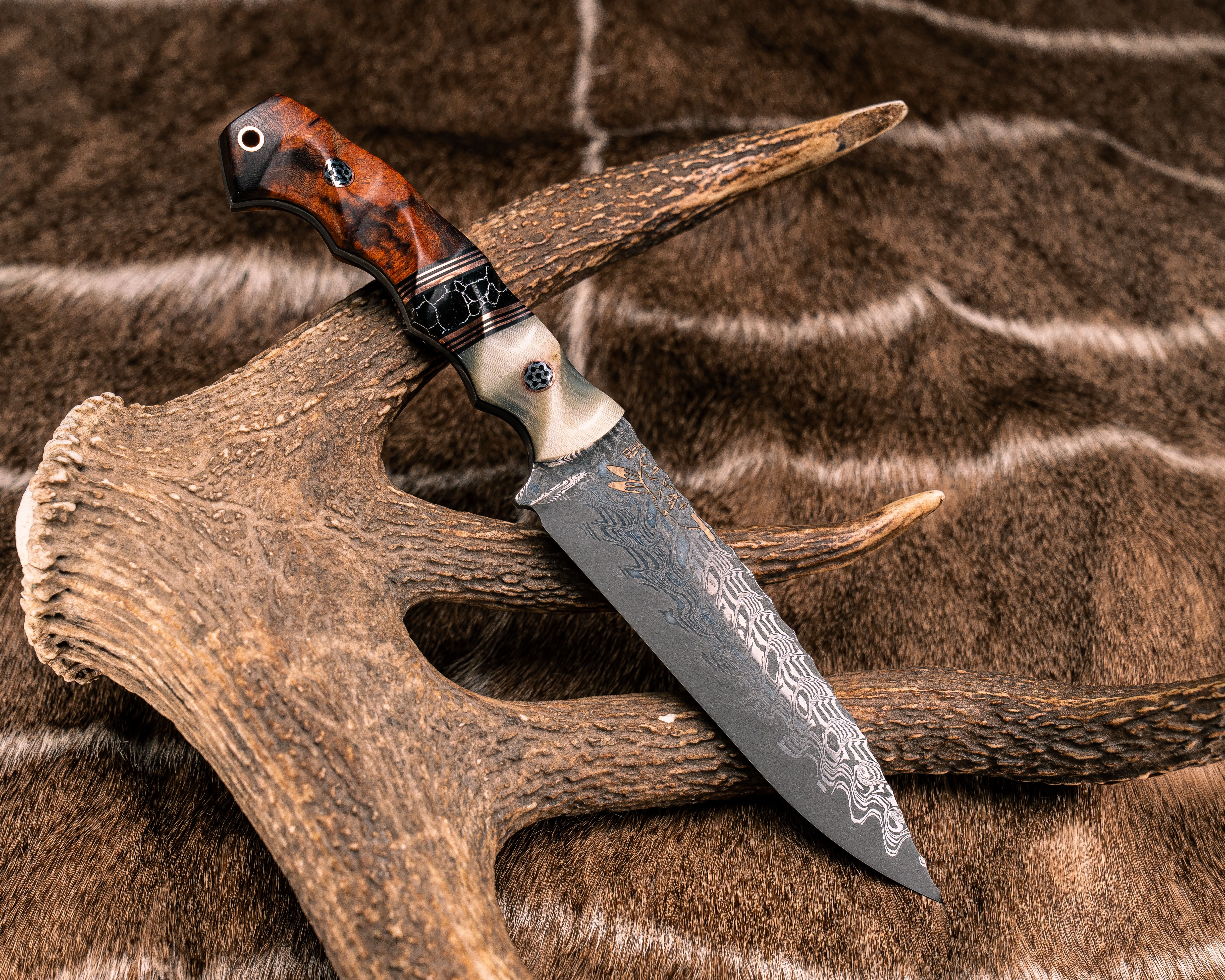 Trench Knife- Baker Forge Raindrop Pattern Damascus- Desert Ironwood, Black G10, Brass and Cherry G10 Pin Striping, American Flag Micarta Split, CO Elk Antler, Patriot Mosaic Pins, Textured Grip