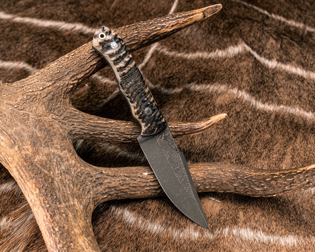Tosahwi #01- Baker Forge Ripple 154/AEBL Core Hollow Grind Stainless Damascus- Giraffe Bone, Mosaic Pins, Center Mosaic Pin with Glow Resin, Textured Grip