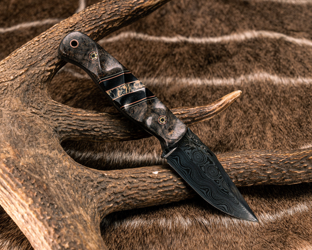 Crow Jr- Desert Ironwood, Black G10 and Copper Pin Striping, Maple Split, Copper Patriot Mosaic Pins, Copper Lanyard Pin, Textured Grip