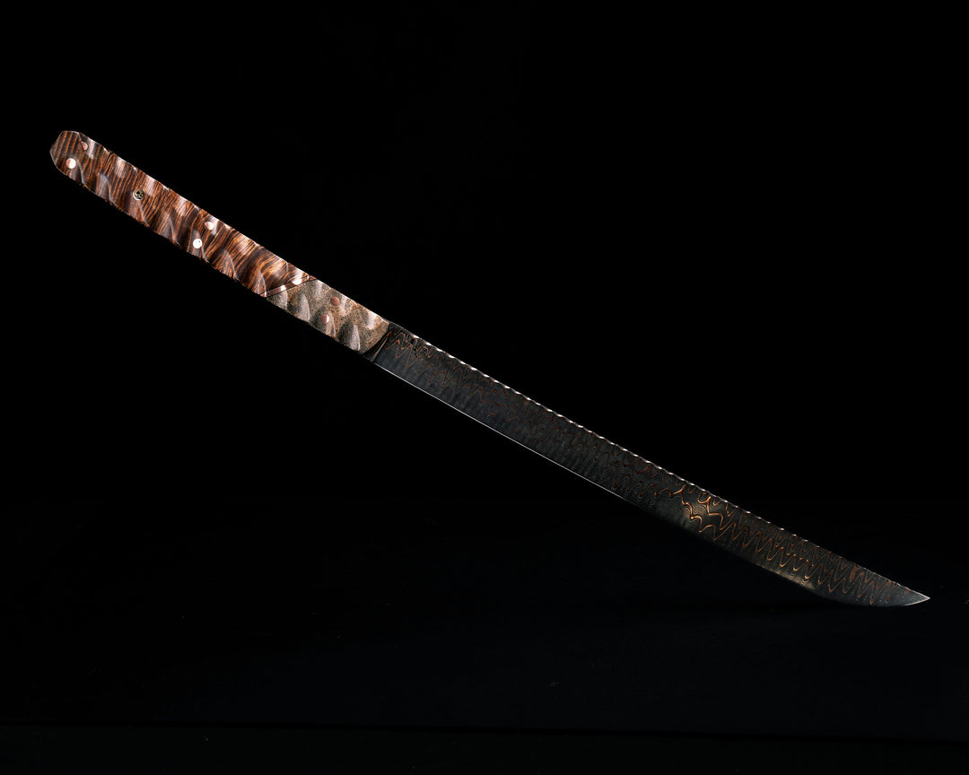 Katana- Baker Forge Firestorm CopperMai Damascus- Dinosaur Bone, Black G10 and Copper Split, Master Grade Hawaiian Curly Koa, Copper Pins, Skull Mosaic Pin, Textured Grip