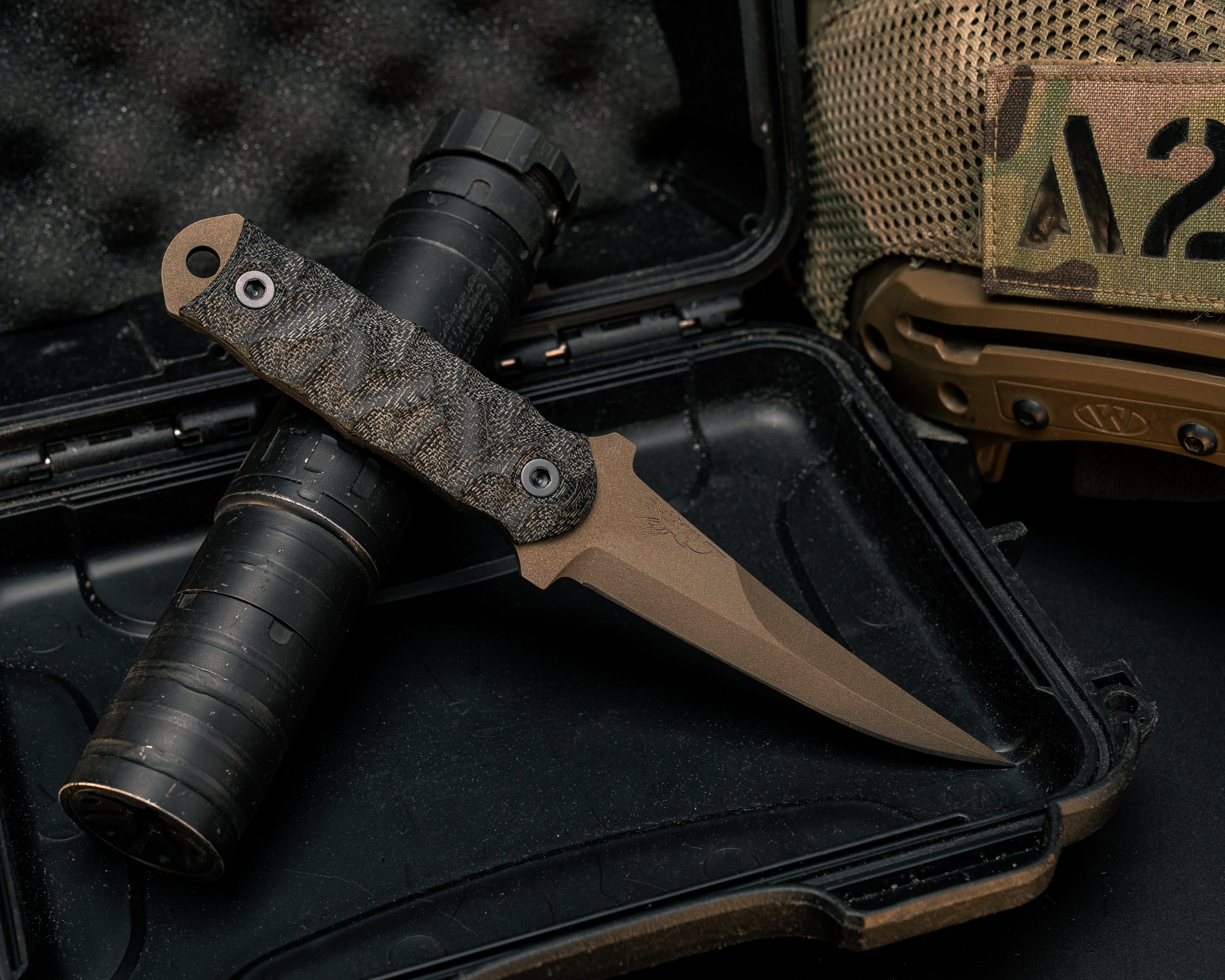 Next: Combat Filet- Black Canvas Micarta, Midnight Bronze Cerakote, Allen Bolts, Textured Grip
