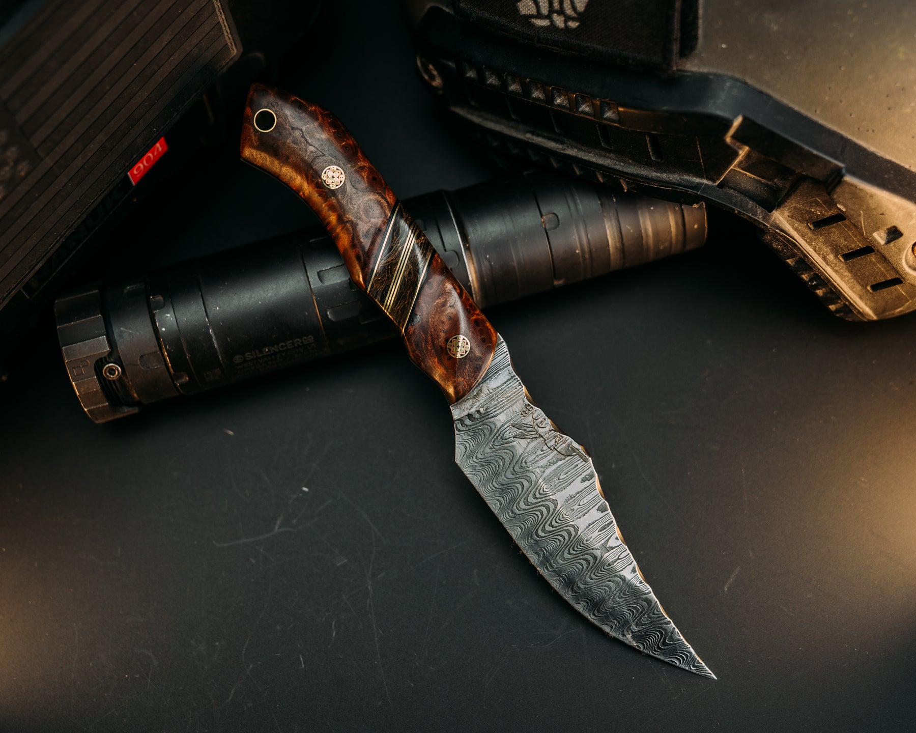Next: Red Cloud- Baker Forge Ladder Pattern Damascus- Black G10, Brass and Natural Micarta Split, Desert Ironwood, Mosaic Pins, Brass Lanyard Pin, Textured Grip