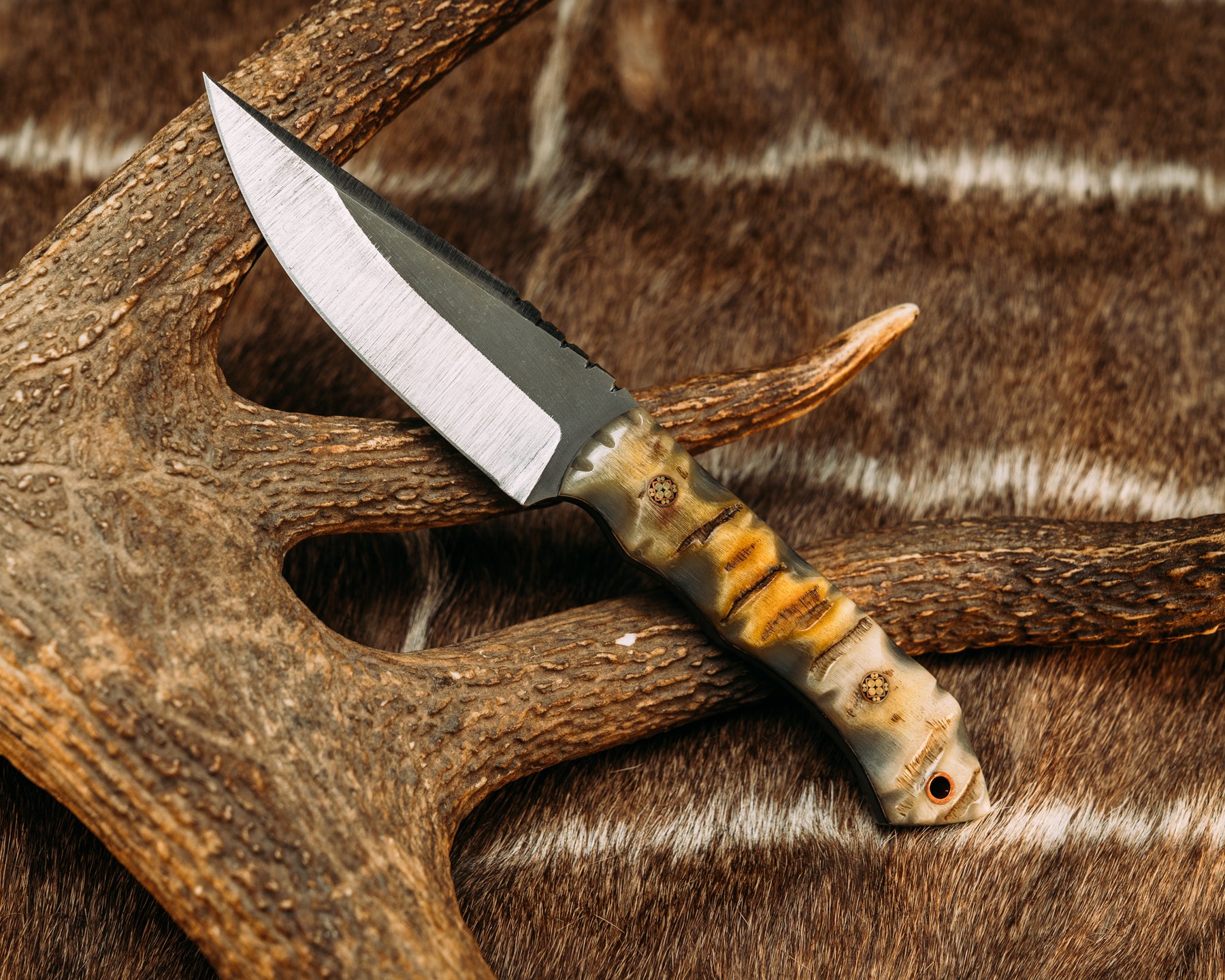 Next: Trench Bowie- Baker Forge Copper GoMai Damascus- Black Ash Burl, Black G10 and Copper Pin Striping, Turquoise with Copper Web Tru-stone Split, Redwood Burl, Copper Patriot Mosaic Pins, Textured Grip