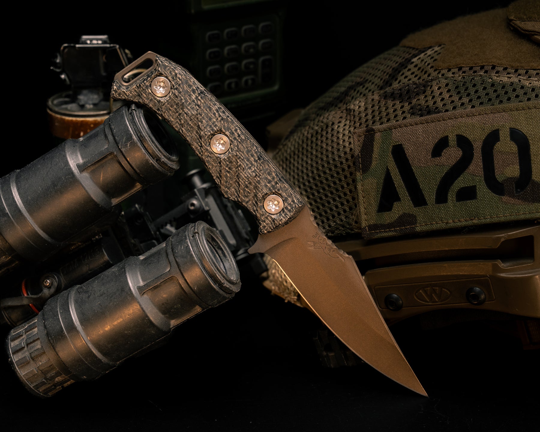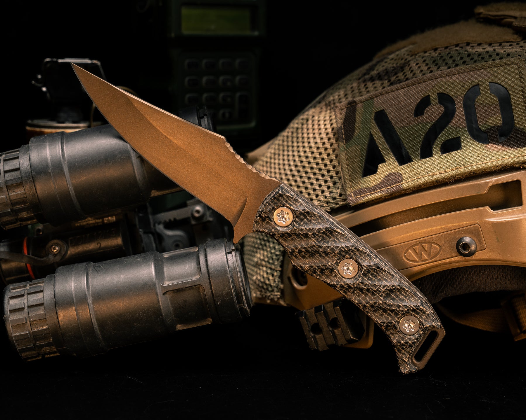Tosahwi- Black Burlap Micarta, Midnight Bronze Cerakote, Ti Torx Bolts