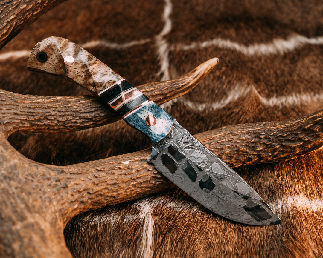 Cav Jr Back Country- Dyed Giraffe Bone, White G10 and Copper Pin Striping, Blue Marbled Carbon and Copper Split, Hawaiian Curly Mango, Copper Pins, CF Lanyard Pin, Textured Grip