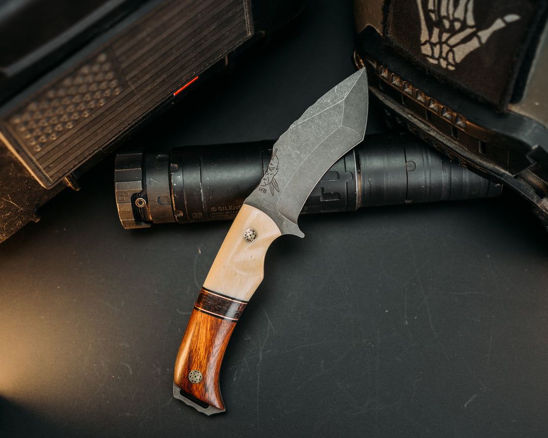 Field Knife (CruWear) - Desert Ironwood, Black G10 & Brass Pin Striping, Hawaiian Curly Koa Split, Mosaic Pins, Textured Grip.
