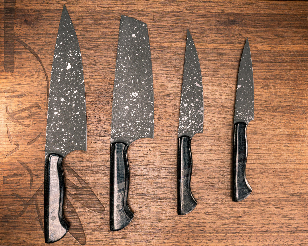 Chef Set- Black Burlap Micarta, Black G10 and Ruby G10 Pin Striping, Black Dark Matter CarbonSplit, Black Dark Matter Carbon, CF Pins, Smooth Grip