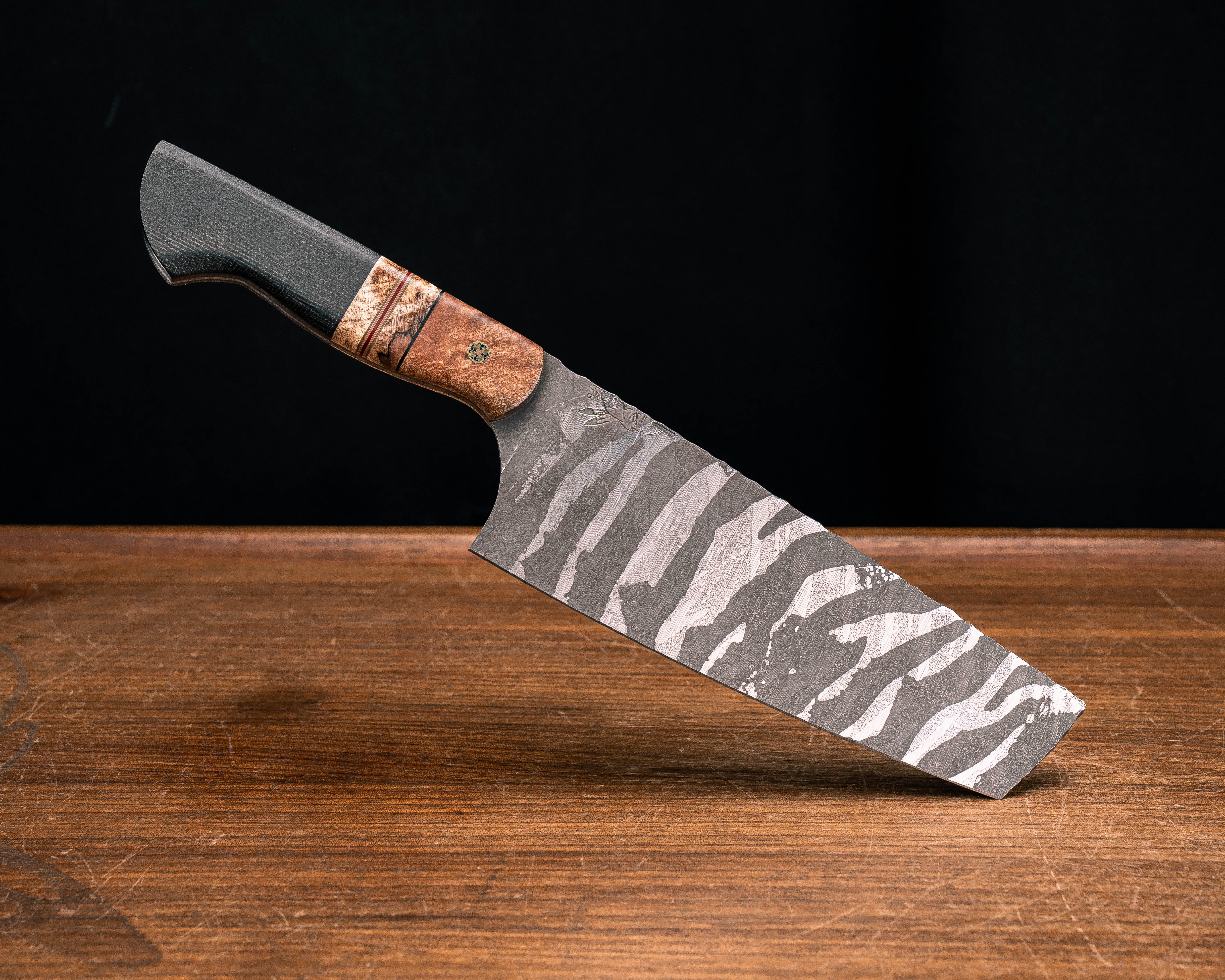 Next: Nakiri- Maple, Black G10, OD Green G10, Copper, Red G10 and Coyote G10 Pin Striping, Spalted Maple Split, Black Canvas Micaela, Mosaic Pin, CF Pin, Smooth Grip