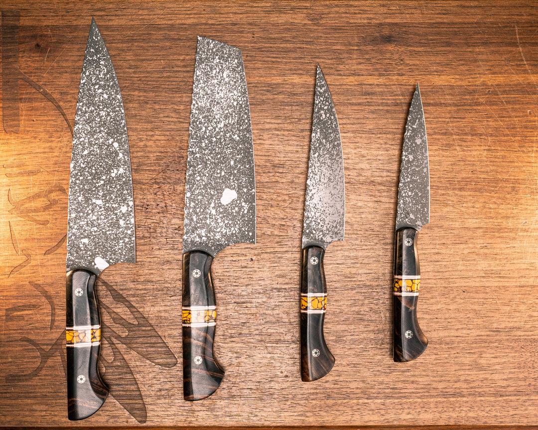 Chef Set- Redwood, Black G10, Copper, and White G10 Pin Striping, Yellow Dino Bone Tru-stone Split, Hawaiian Curly Koa, Mosaic Pins, Smooth Grip