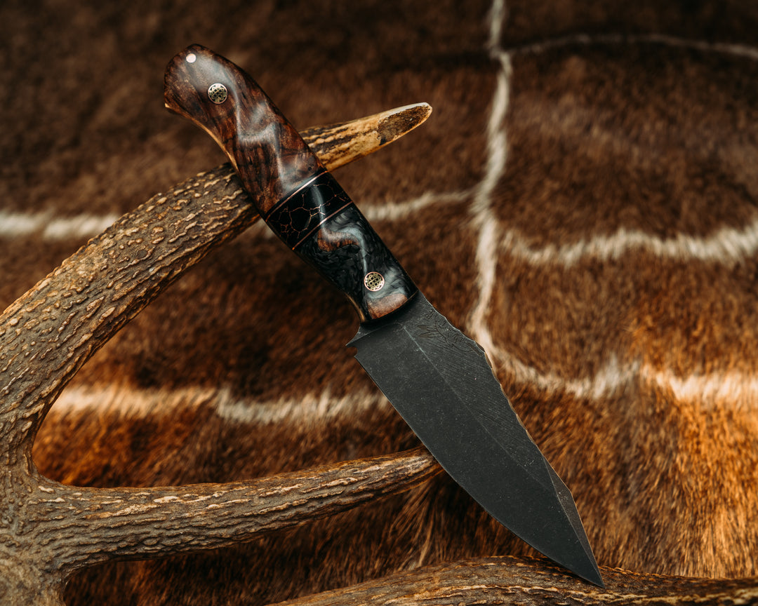 Field Knife (CruWear) - Maple over Carbon, Black G10 and Copper Pin Striping, Black with Copper Web Tru-stone Split, Maple, Mosaic Pins, 1/8" Copper Pin, Textured Grip