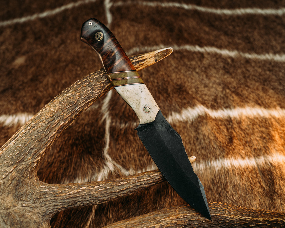 Crow Scout- Desert Ironwood, Black G10 and Brass Pin Striping, Desert Ironwood Split, Giraffe Bone, Mosaic Pins, Textured Grip