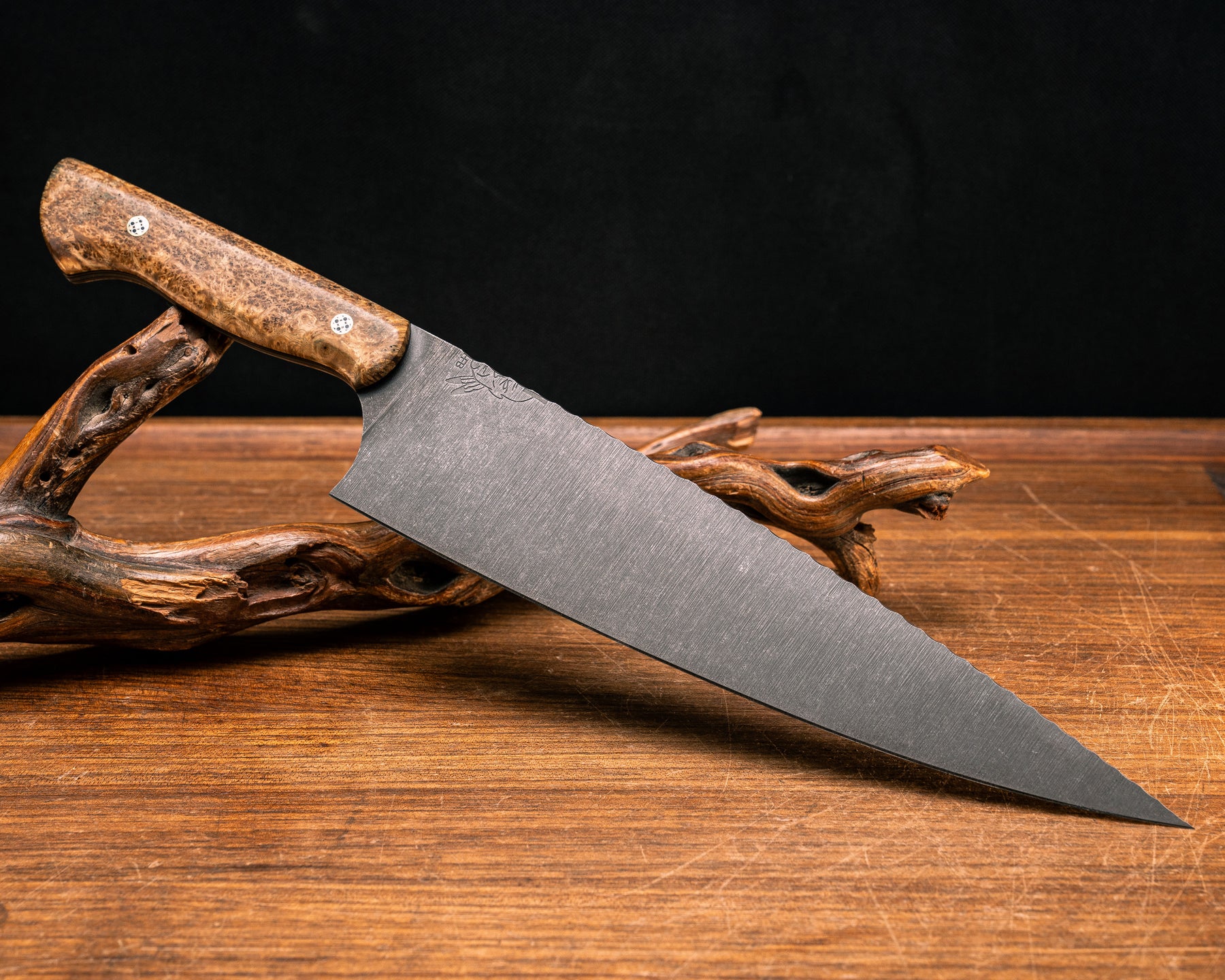 10" Chef Blade- BLack Ash Burl, Black G10 with Copper Liner, Mosaic Pins, Smooth Grip
