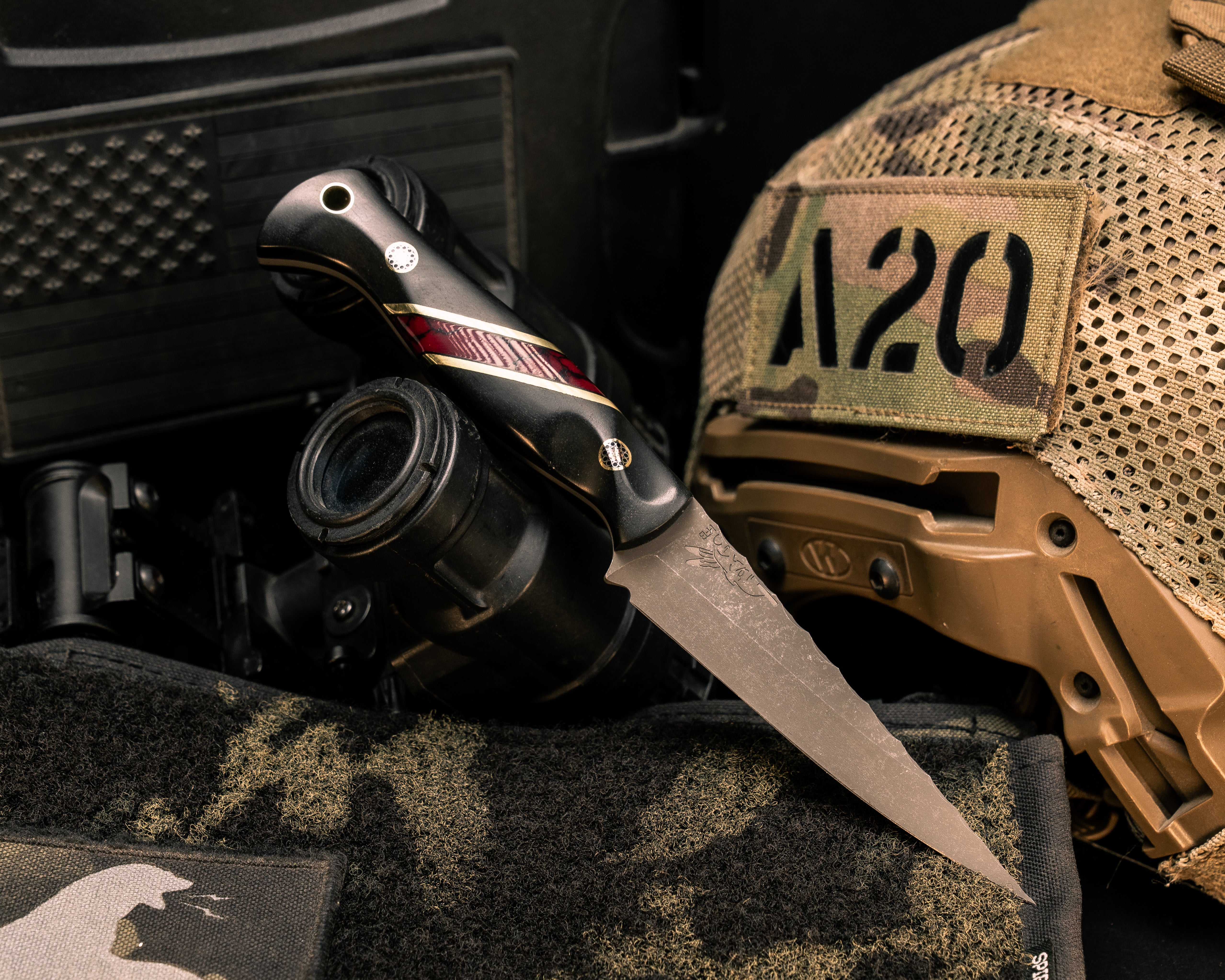 Next: Congressman- Bison Horn, Black G10, Brass and Bloody Basin Tru-stone Split, Mosaic Pins, Brass Lanyard Pin, Textured Grip