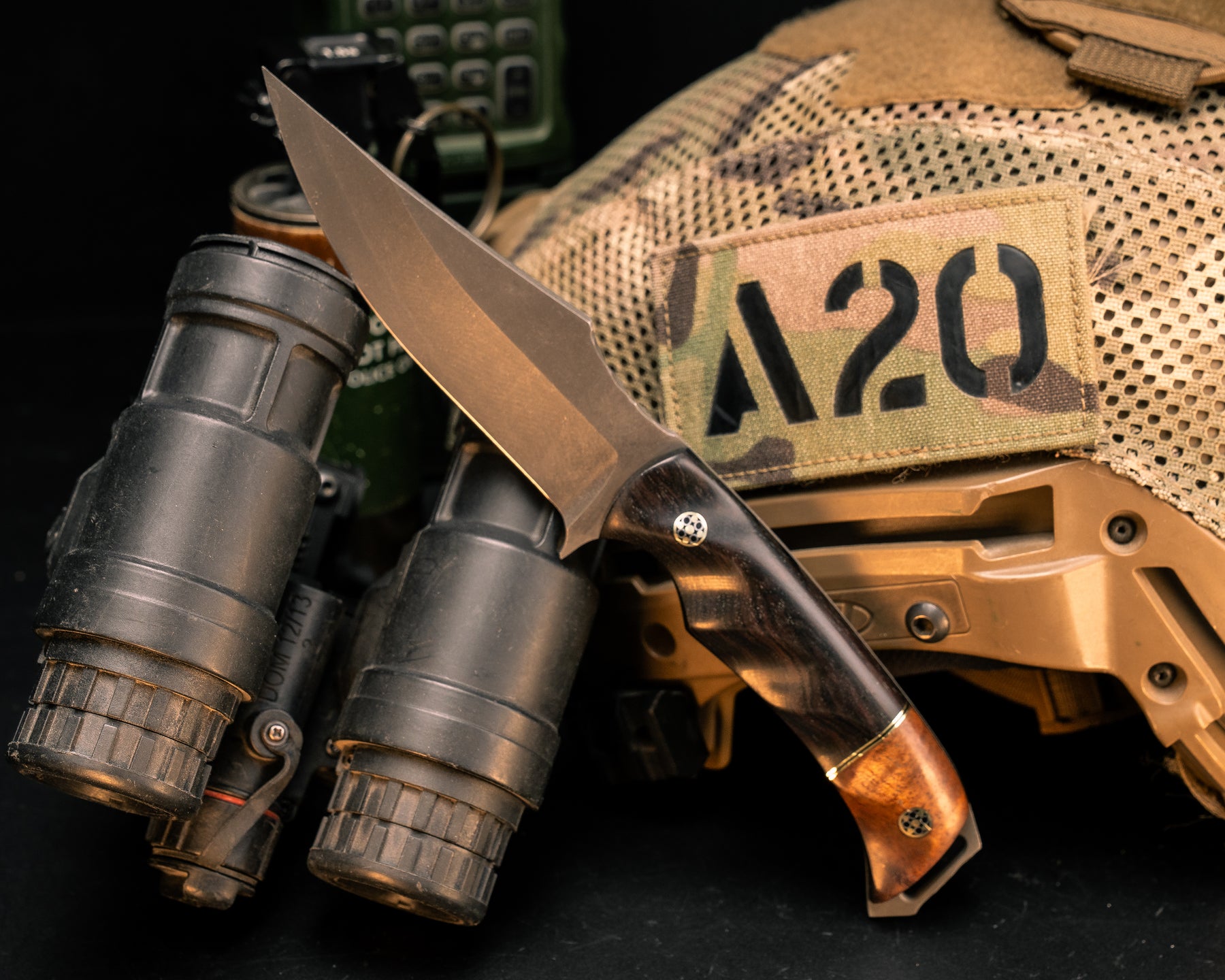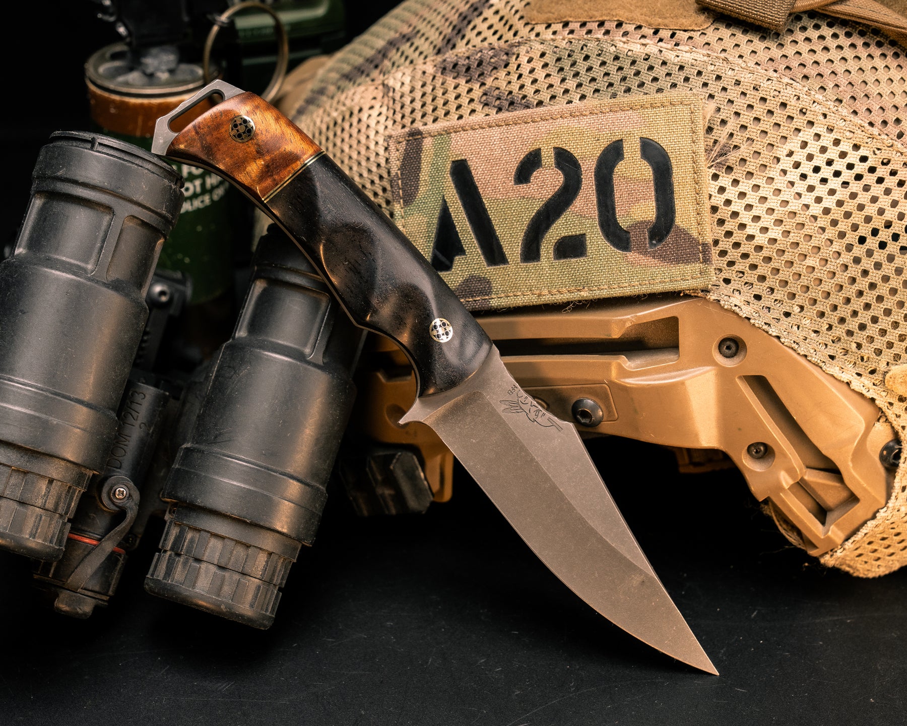 Next: Field Knife- Redwood Burl, Black G10 and Copper Pin Striping, White with Copper Matrix Tru-stone Split, Copper Patriot Pins, 1/8" Copper Pin, Textured Grip