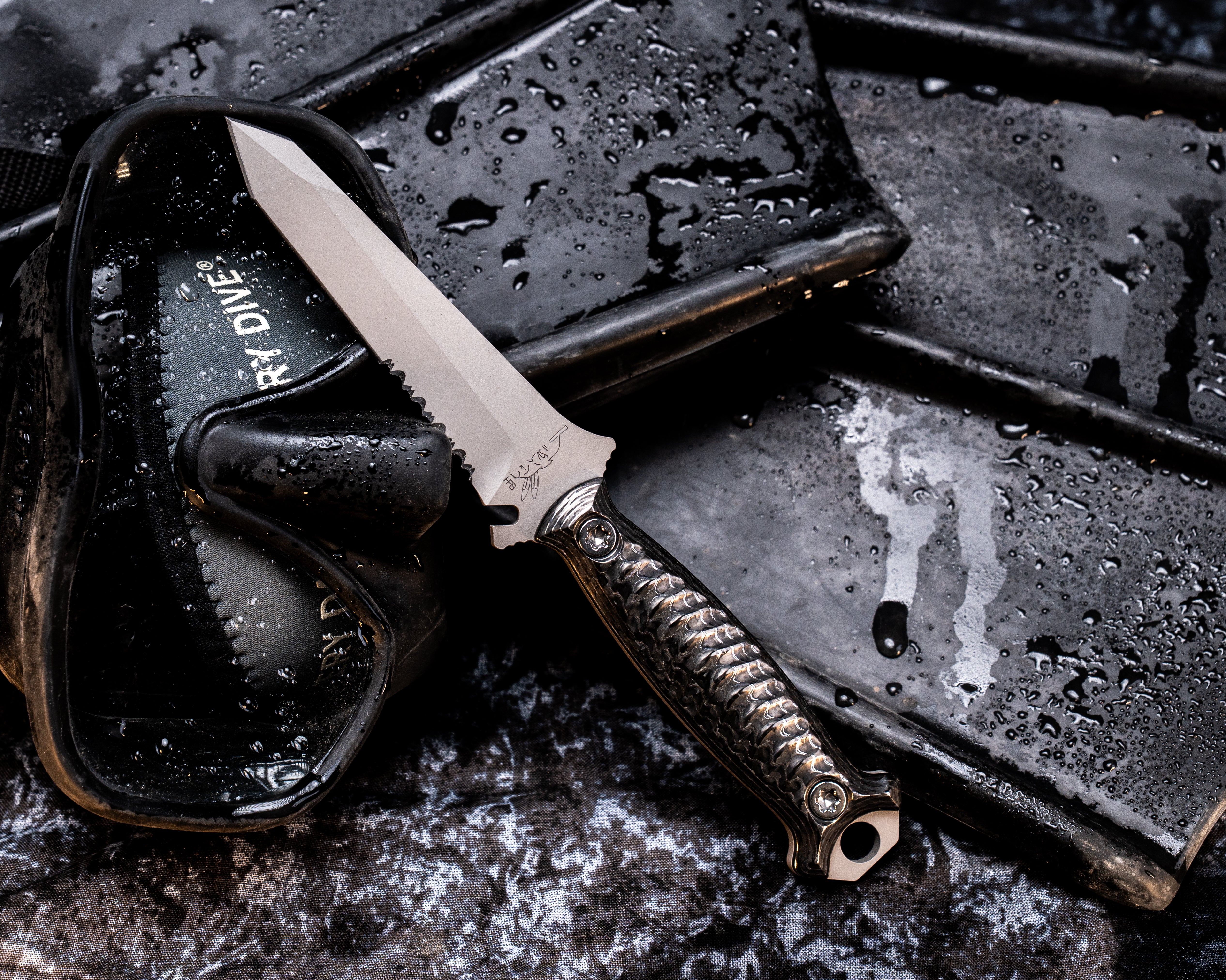 Next: Dive Knife Tanto- Stainless Steel Dragon Strike Carbon, Steel Grey Cerakote, Ti Torx Bolts, Textured Grip