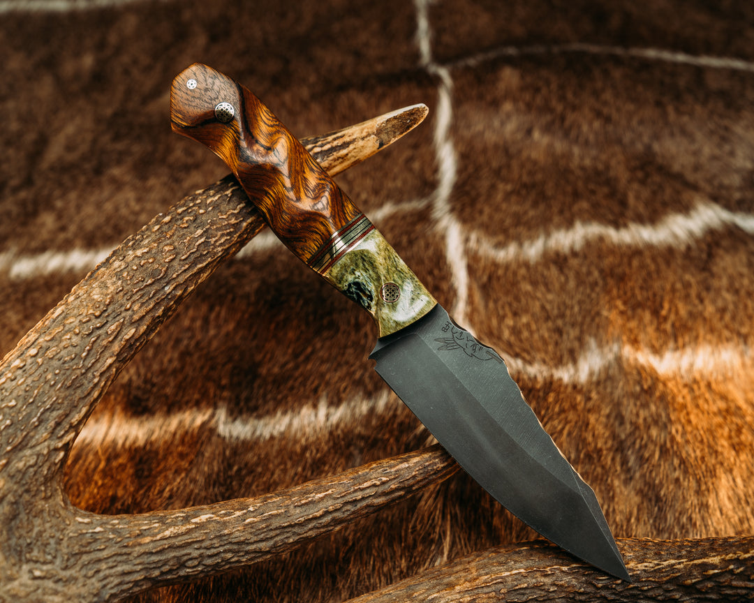 Field Knife (CruWear) - Dyed Giraffe Bone, Brass, Natural Micarta and Black G10 Split, Desert Ironwood, Mosaic Pins, Textured Grip