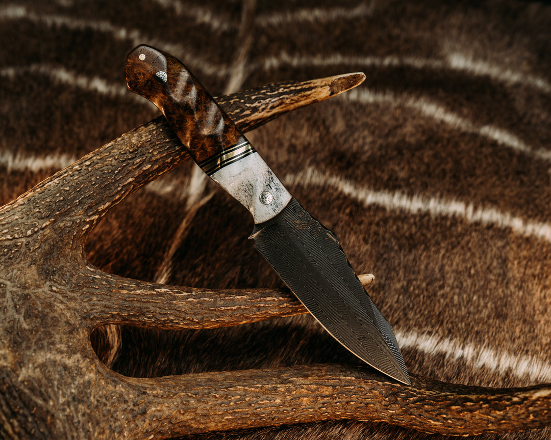 Field Knife - Vegas Forge Lightning Damascus - CO Elk, Black G10 & Brass Split, Amboyna, Mosaic Pins, Textured Grip