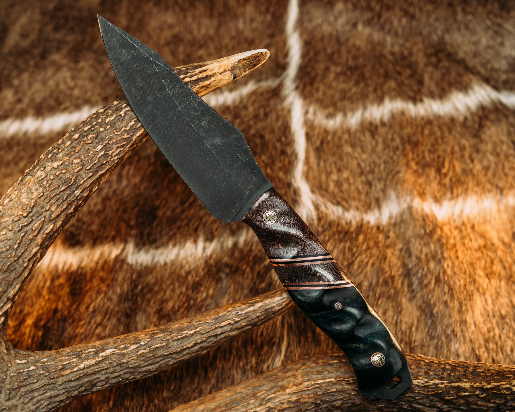 Field Knife (CruWear) - Copper Space Coral Carbon, Black G10 and Copper Pin Striping, Copper Space Coral Carbon Split, Dyed Redwood, Mosaic Pins, Textured Grip