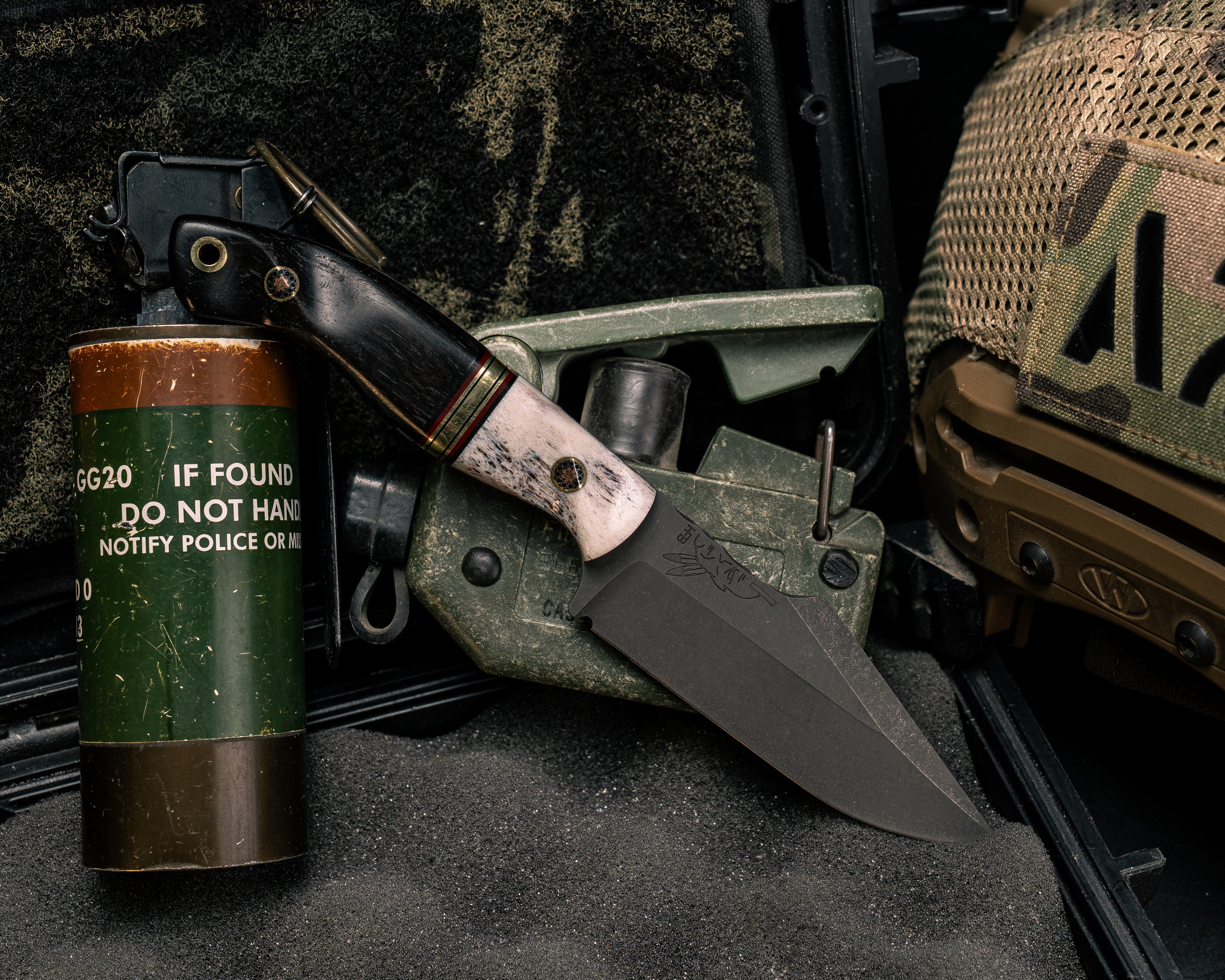 Next: Widow Maker JR- CO Elk Antler, Black G10, Red G10 and Brass Split, African Blackwood, Mosaic Pins, Brass Lanyard Pin, Textured Grip