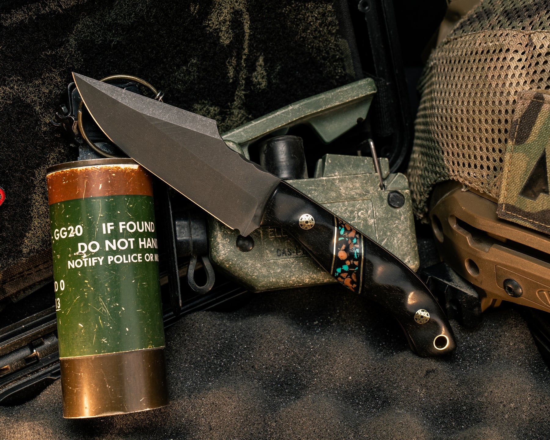 Widow Maker JR- African Blackwood, Black G10 and Brass Pin Striping, Tucson Pebble Polyclast Split, Brass Mosaic Pins, Brass Lanyard Pin, Textured Grip