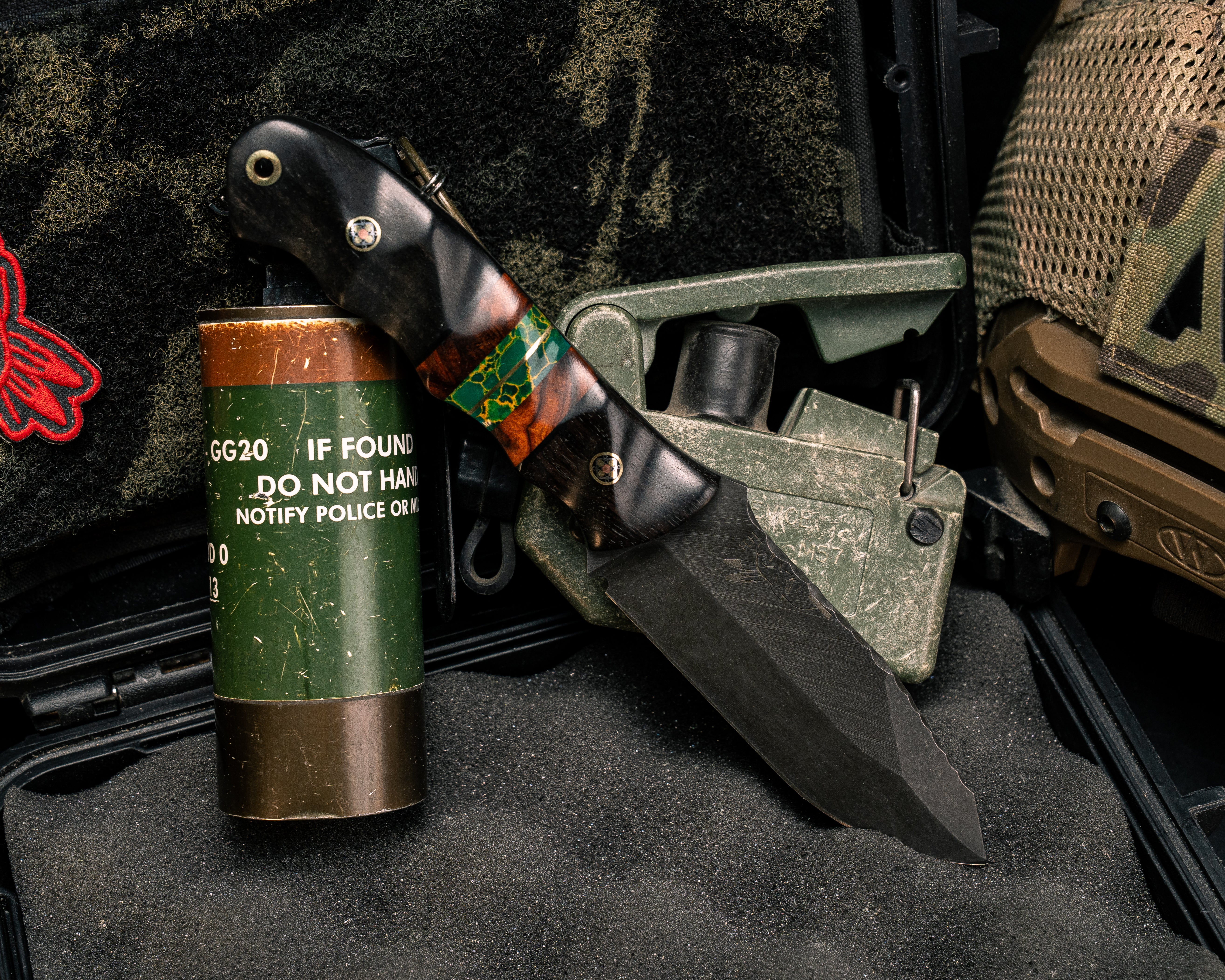 Next: Disaster Jr- African Blackwood, Desert Ironwood, Arizona Jade Tru-stone and Brass Split, Mosaic Pins, Brass Lanyard Pin, Textured Grip