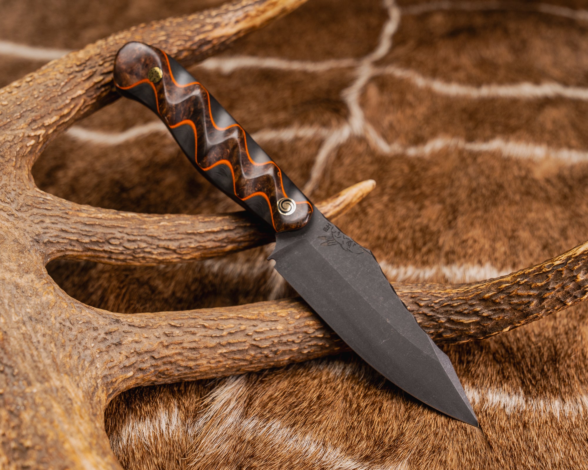 Crow Scout- Dyed Redwood, Black G10 and Copper Pin Striping, Desert Tan G10 and Black with Copper Web Tru-stone Split, Giraffe Bone, Mosaic Pins, Copper Lanyard Pin, Textured Grip