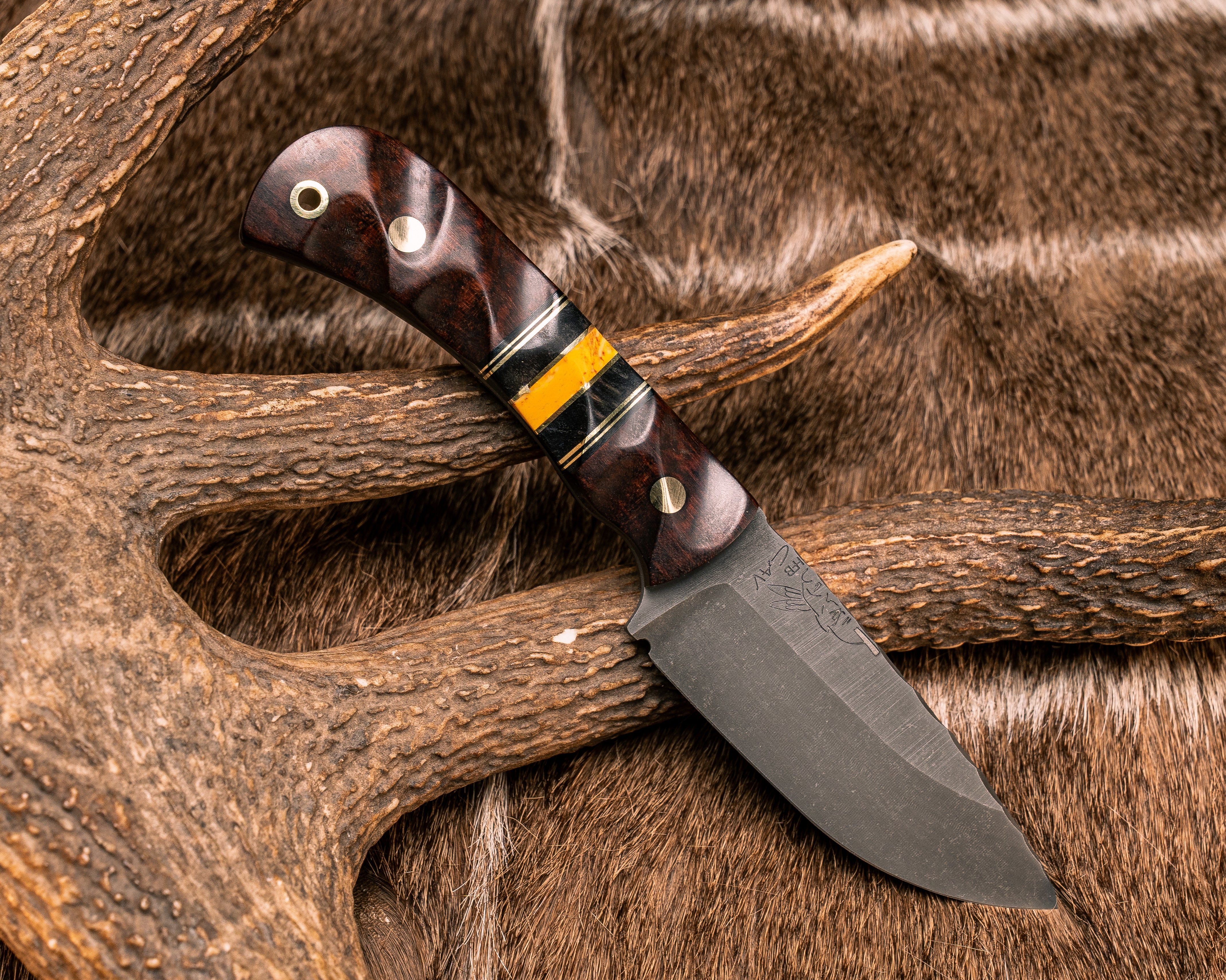 Next: Cav Jr- Snakewood, Black G10 and Brass Pin Striping, Dyed Maple and Yellow Dino Bone Tru-stone Split, Brass Pins, Brass Lanyard Pin, Textured Grip