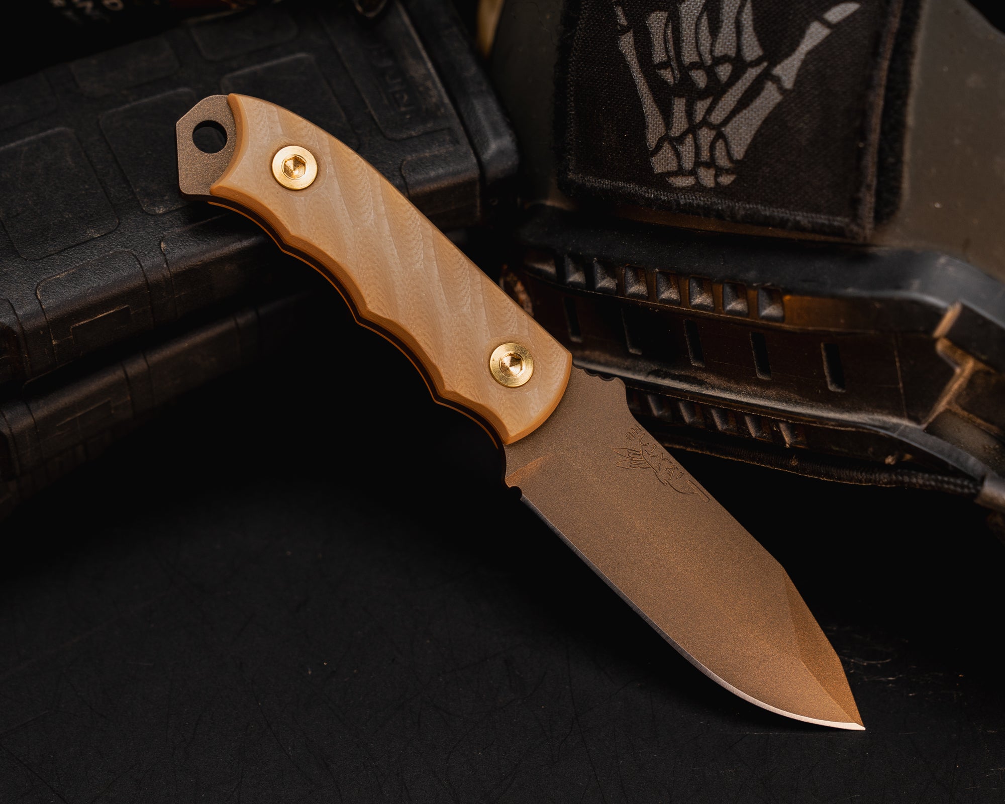 Next: Disaster Cub - Ghost/Coyote G10, Midnight Bronze Cerakote, Brass Bolts, Iron Grip.
