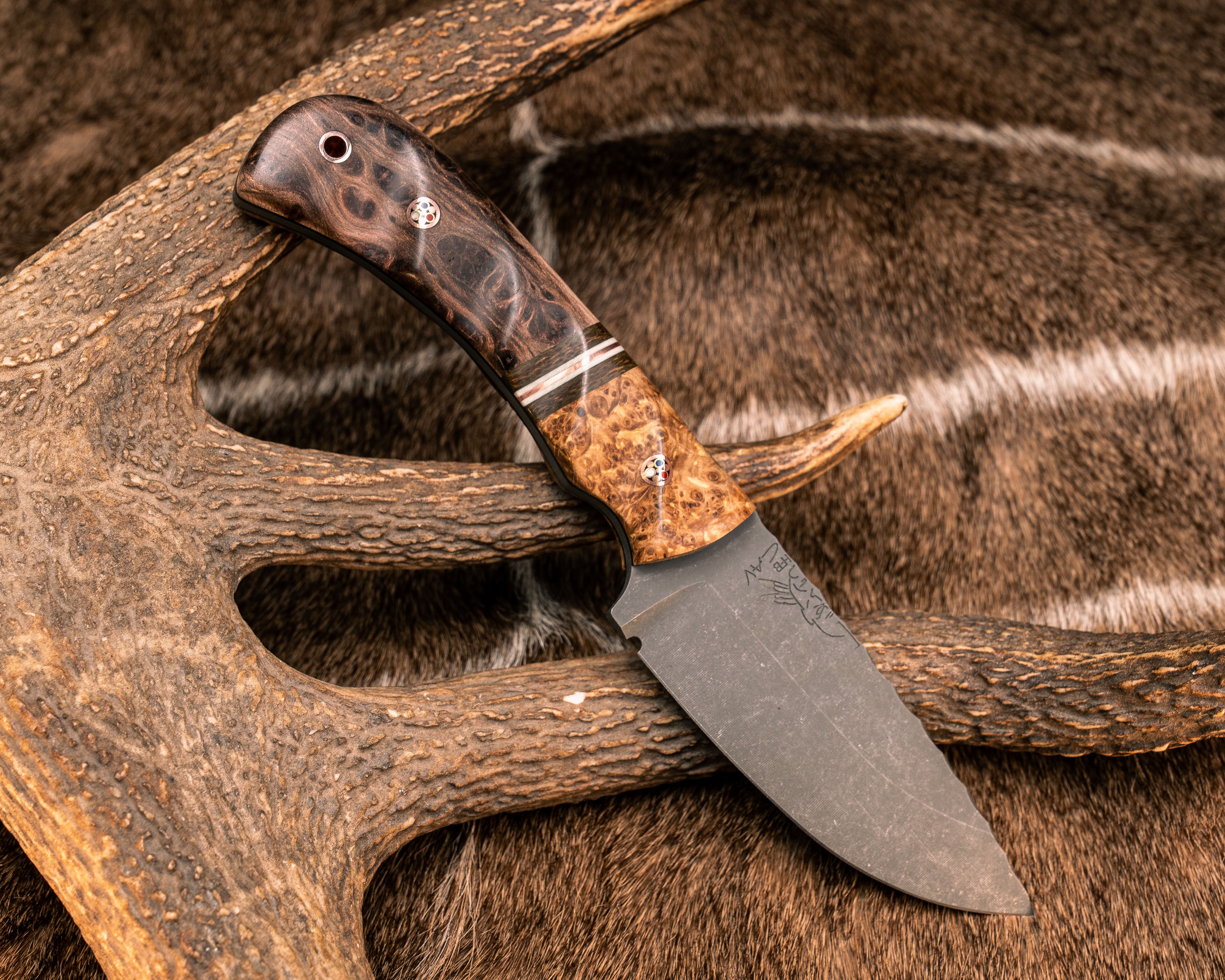 Next: Cavner- Black Ash Burl, Brown Canvas Micarta, White G10 and Copper Split, Redwood Burl, Copper Patriot Mosaic Pins, Copper Lanyard Pin, Textured Grip