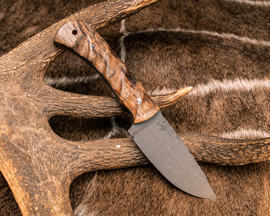 Crow Jr- Dyed Maple, Carbon, Brass and White Resin Split, CO Elk Antler Over Fire Canvas Micarta and Black G10, Mosaic Pins, Brass Lanyard Pin, Textured Grip