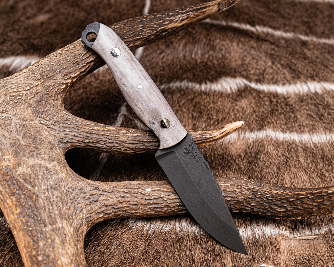 Crow Scalper - Giraffe Bone, Black & Ivory G10 w/ Brass Pin Striping, Fire Canvas Micarta Split, Desert Ironwood, Mosaic Pins, Copper Lanayrd Pin, Contoured Grip.