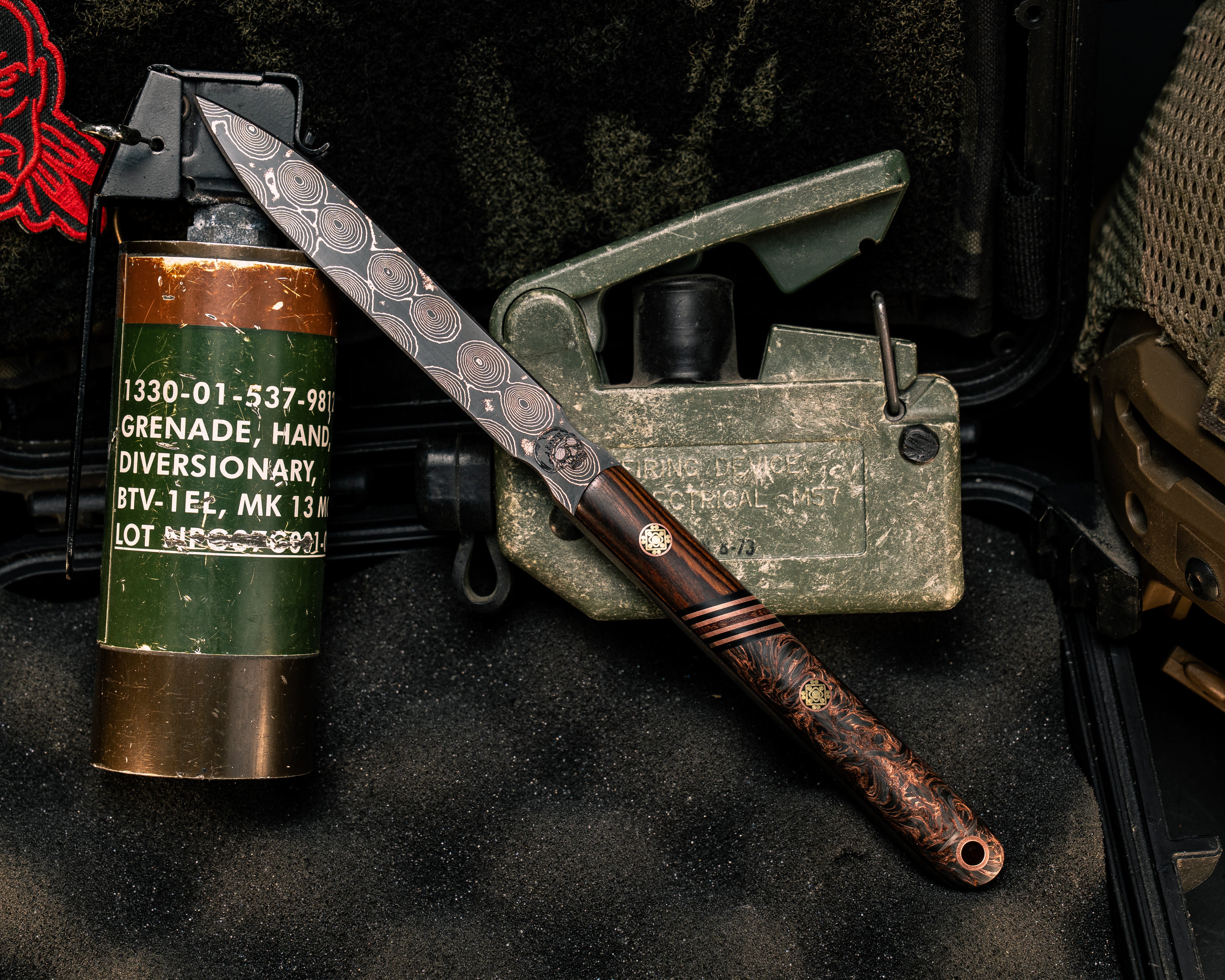 Next: OSS Spike- Baker Forge Raindrop CopperMai- Desert Ironwood, Black G10, Copper and Red Canvas Micarta Split, Copper Dark Matter Carbon, Mosaic Pins, Copper Lanyard Pin, Smooth Grip