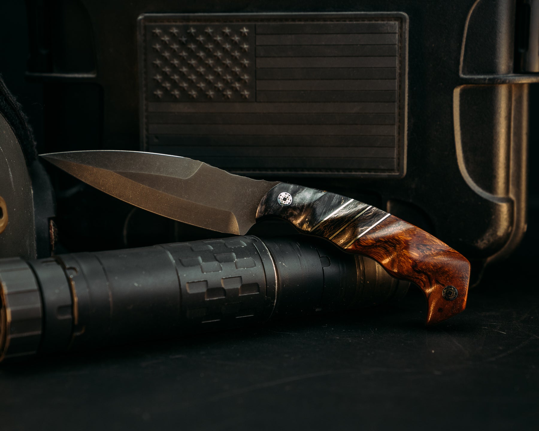4" HUMINT - Dyed Redwood, Black G10 & Brass Pin Striping, Gold Dark Matter Carbon Fiber, Desert Ironwood, Mosaic Pins, Textured Grip.
