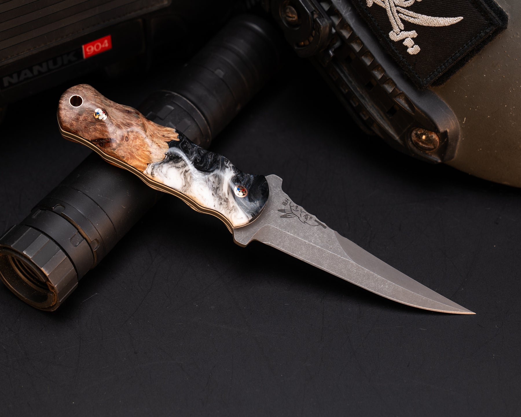 Combat Filet- Black and White Swirl Resin and Burlwood, Patriot Mosaic
