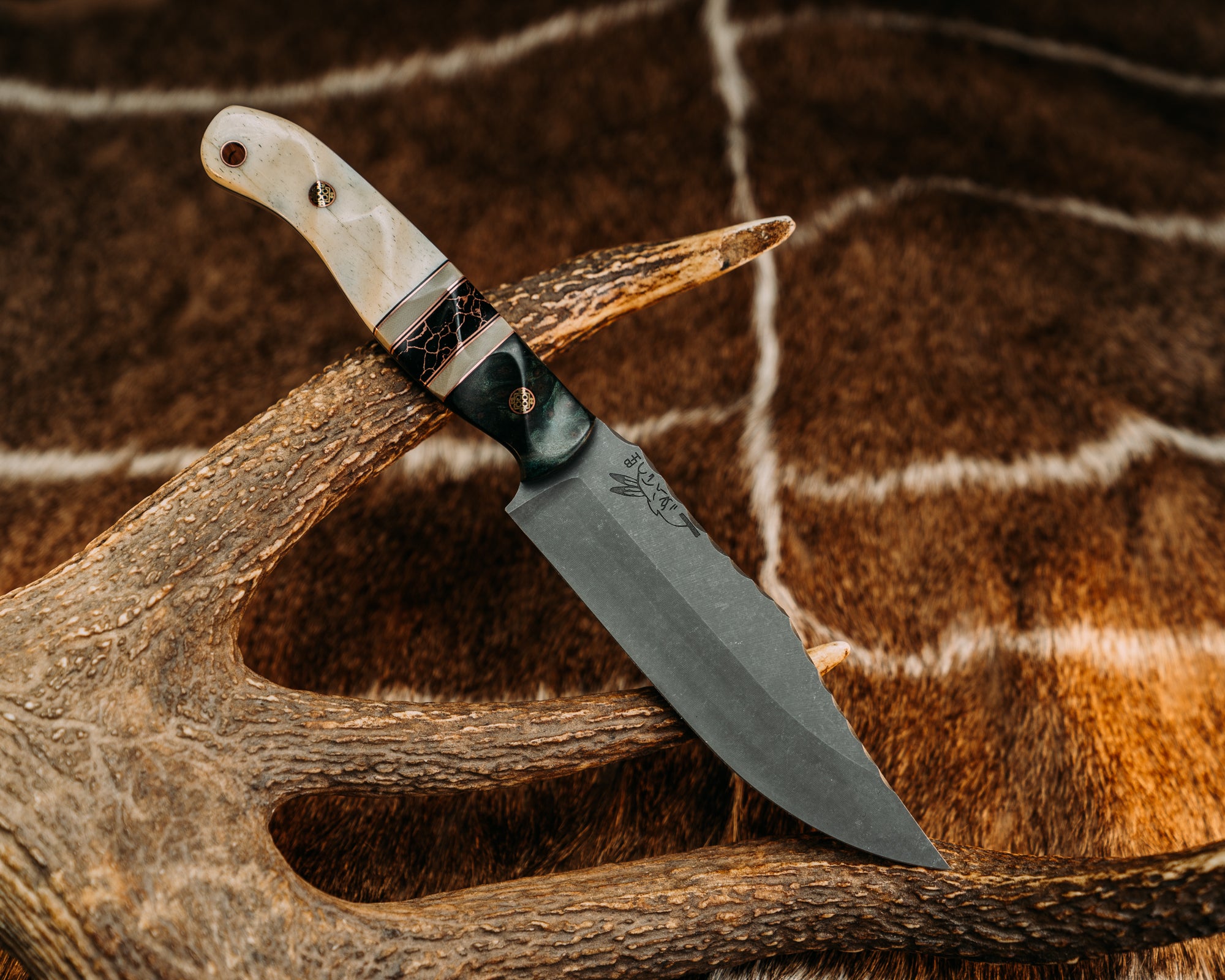 Next: Crow Scout- Dyed Redwood, Black G10 and Copper Pin Striping, Desert Tan G10 and Black with Copper Web Tru-stone Split, Giraffe Bone, Mosaic Pins, Copper Lanyard Pin, Textured Grip