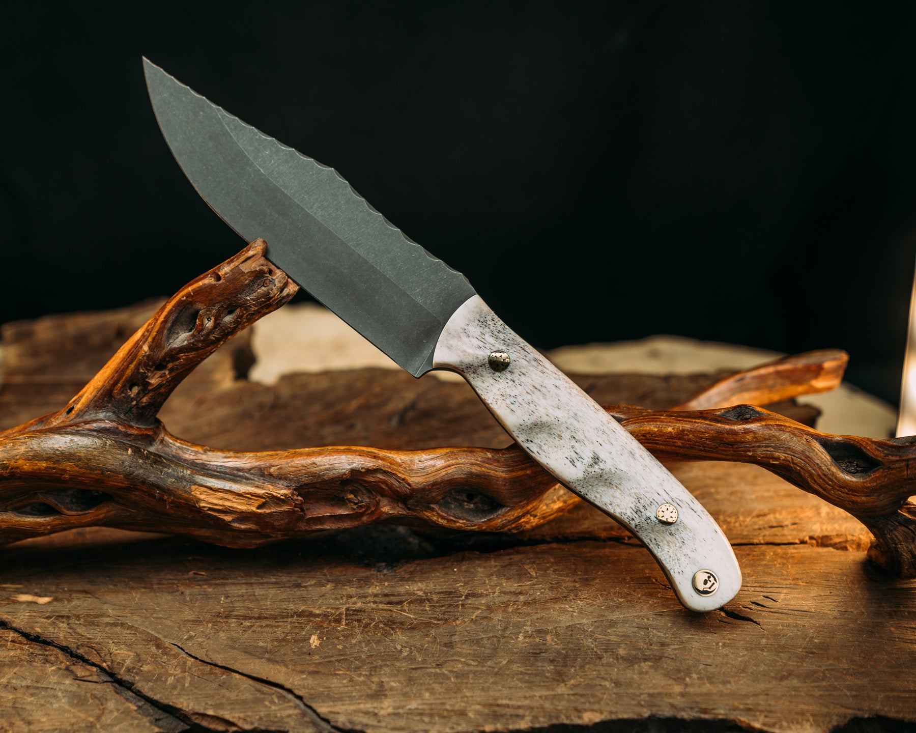 Next: Field Knife (CruWear) - Desert Ironwood, Black G10 & Brass Pin Striping, Hawaiian Curly Koa Split, Mosaic Pins, Textured Grip.