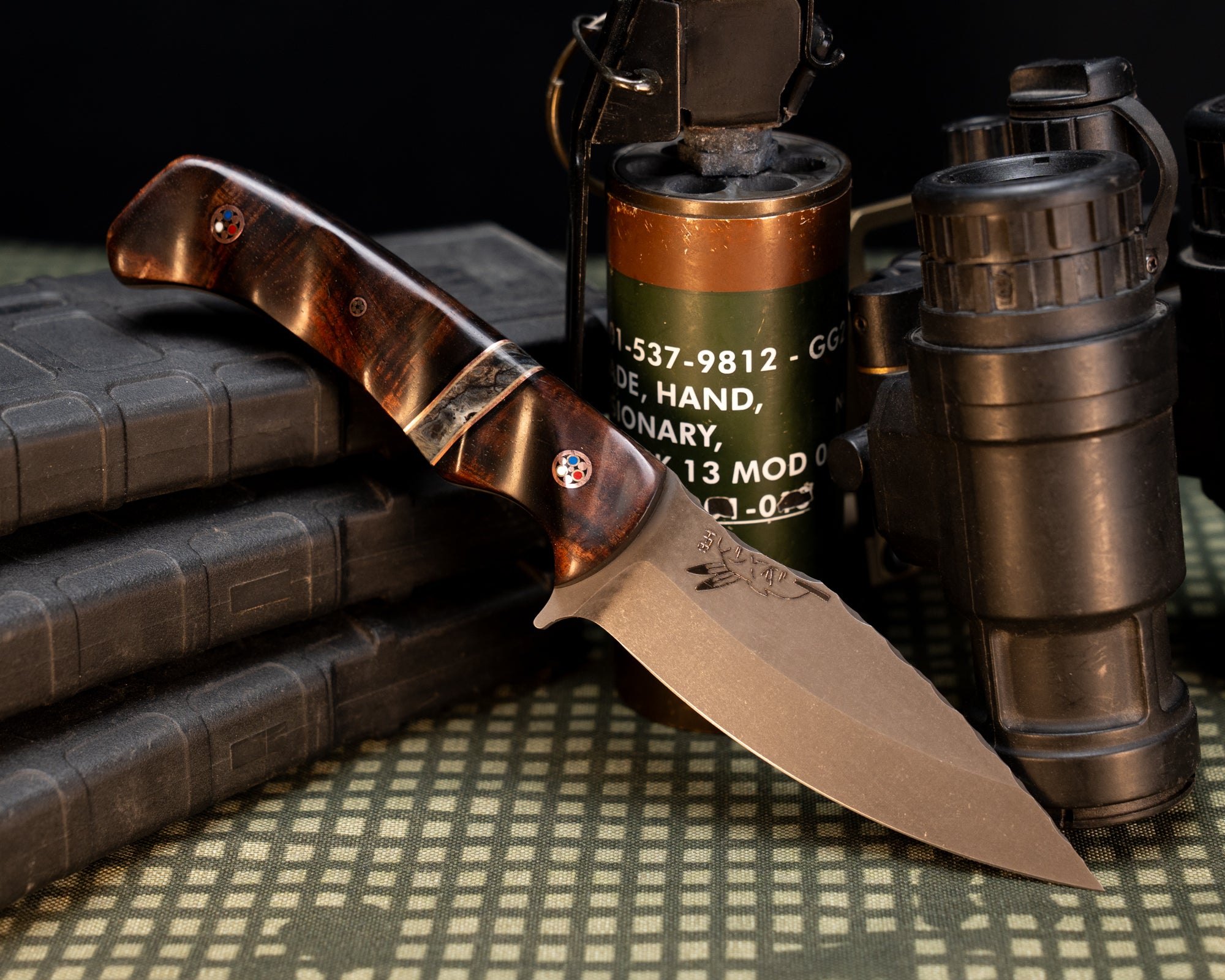 Next: Ishi- Hawaiian Curly Koa, Black G10 and Copper Pin Striping, Dyed Maple Split, Spine Work and Resin, Patriot Mosaic Pins, 1/8" Mosaic Pin, Grooved Grip