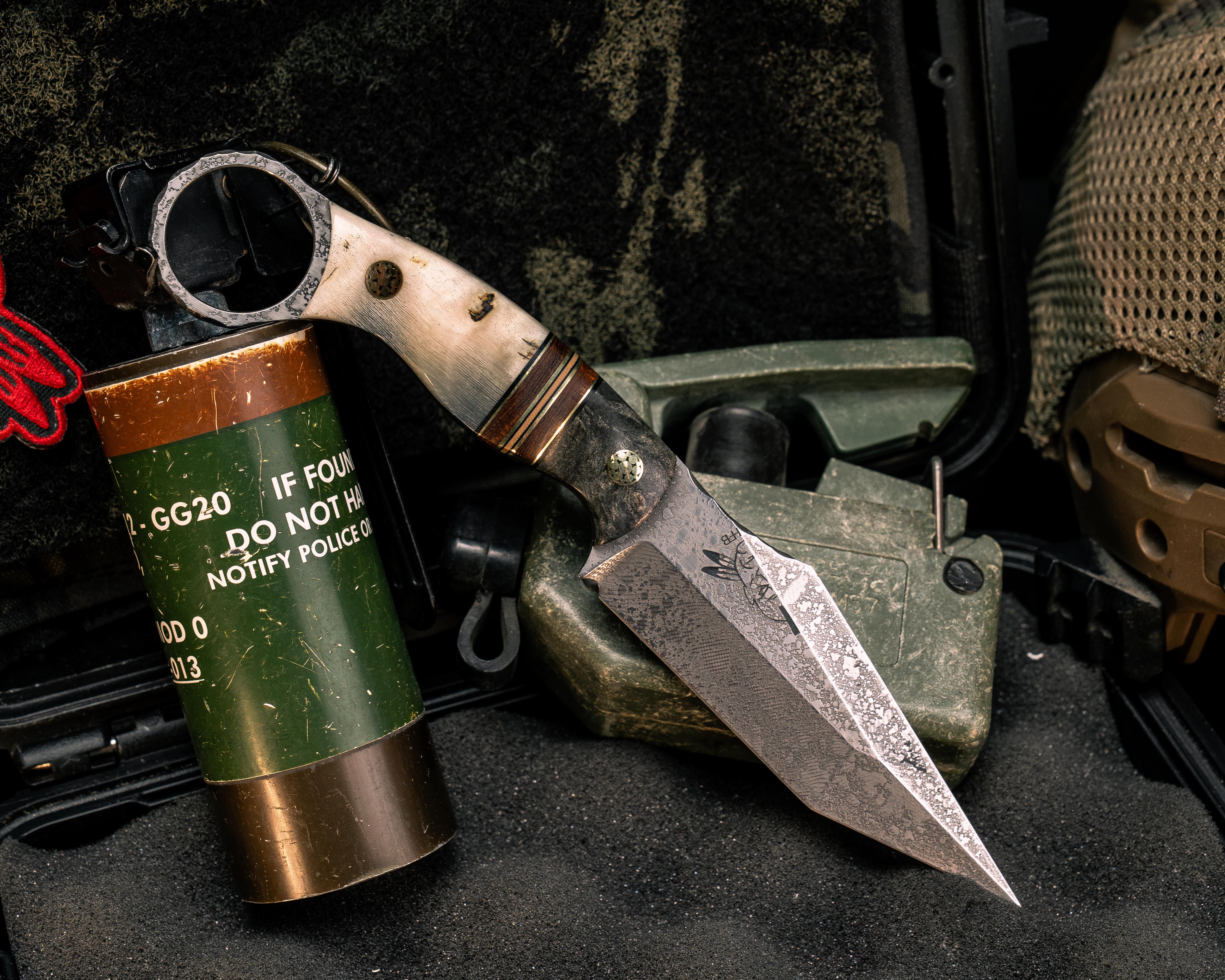 Next: Ring Tac Tanto- Dyed Buckeye, Black G10, Brass, Desert Ironwood and Coyote G10 Split, Rams Horn, Mosaic Pins, Textured Grip