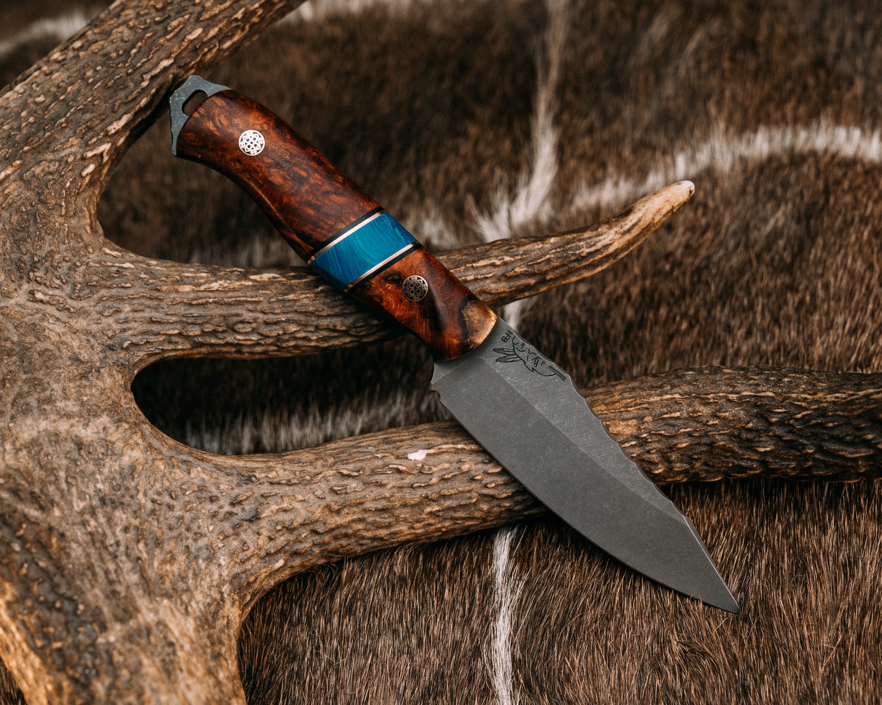 Field Knife Jr- Amboyna Burl, Black G10 and Copper Pin Striping, Blue
