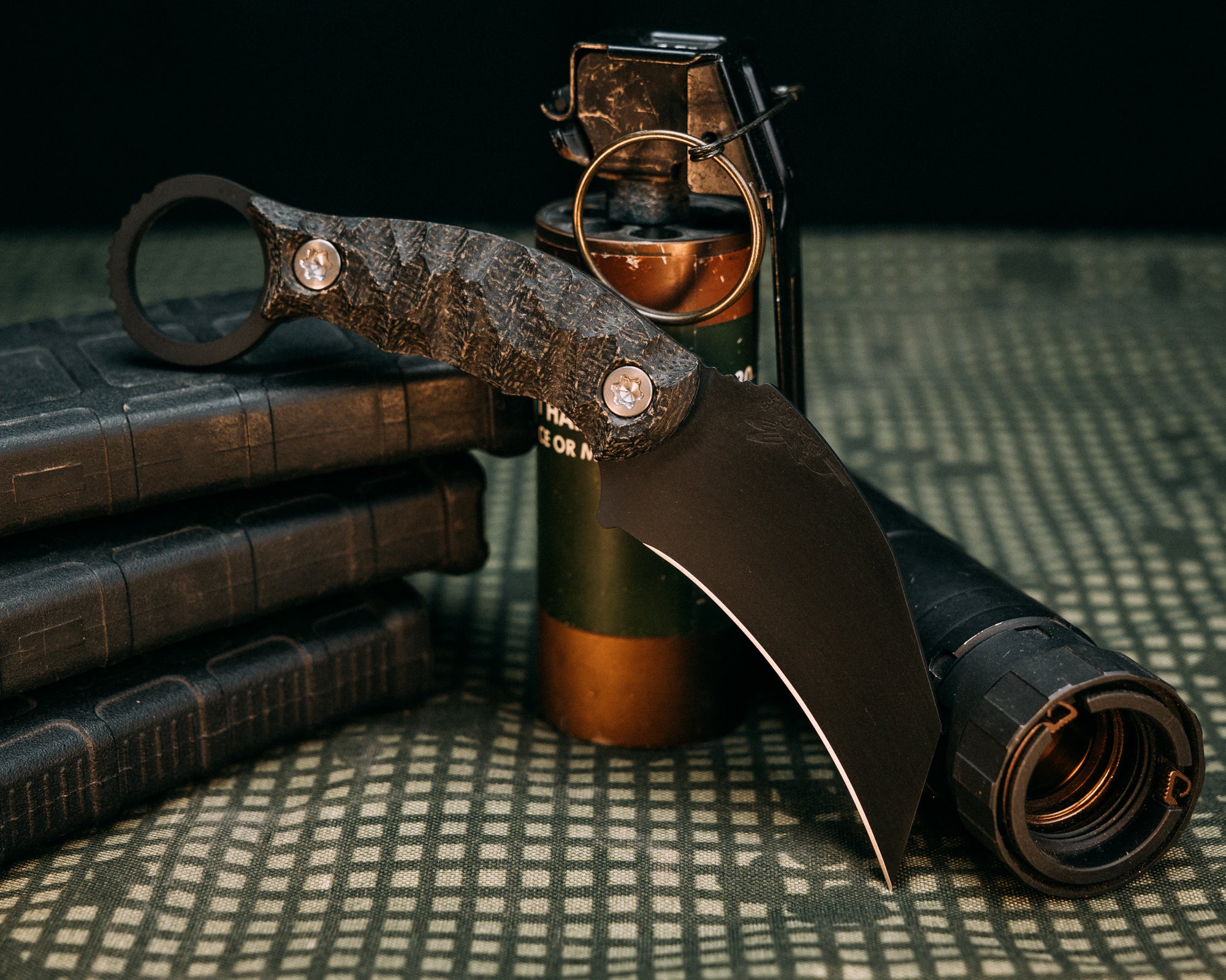 Next: Karambito - Black Burlap Micarta, Armor Black, Ti Torx Bolts, Chaos Grip.