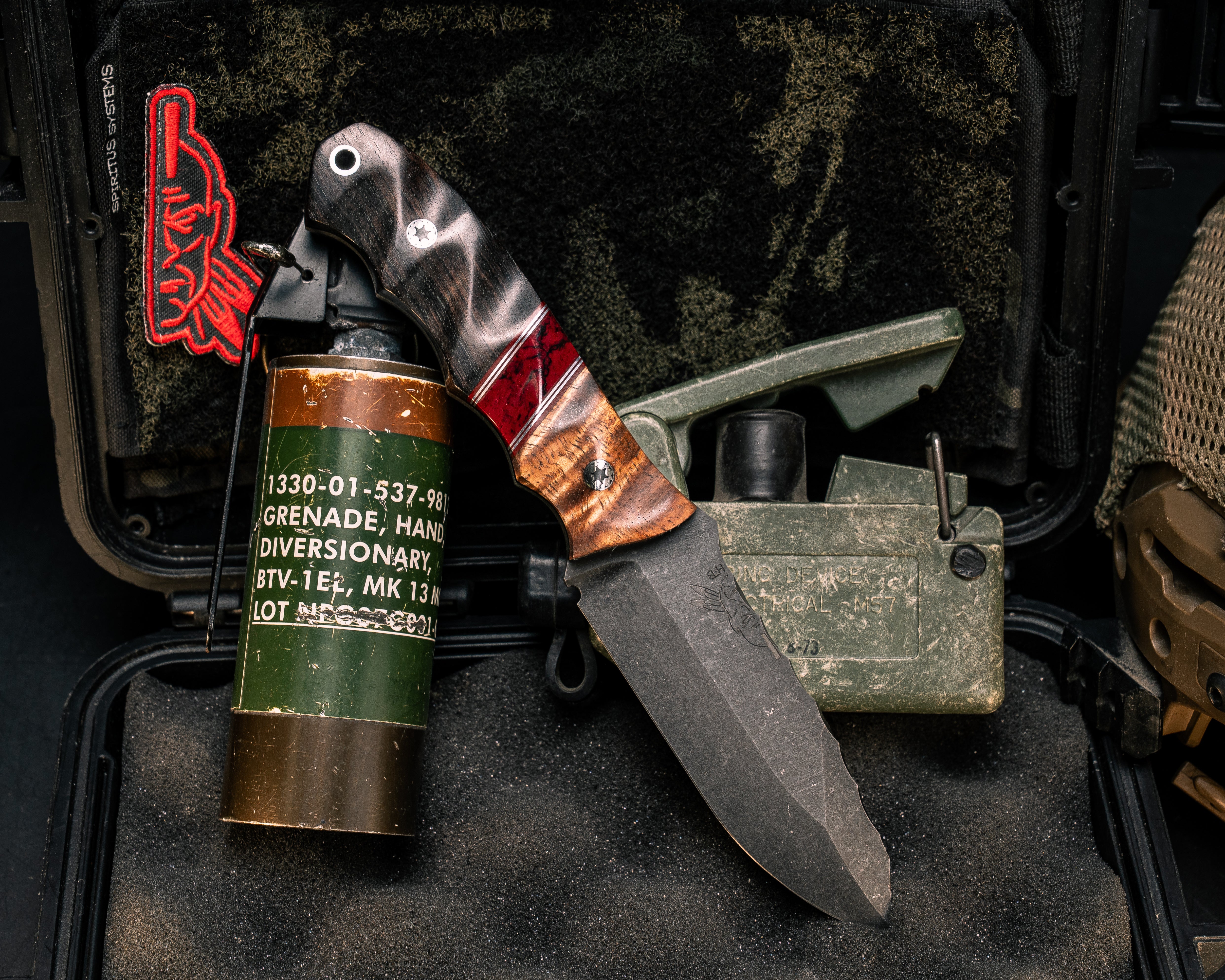 Next: Disaster Jr- Hawaiian Curly Koa, Cherry G10 and Aluminum Pin Striping, Bloody Basin Tru-stone Split, Gaboon Ebony, Mosaic Pins, Aluminum Lanyard Pin, Textured Grip