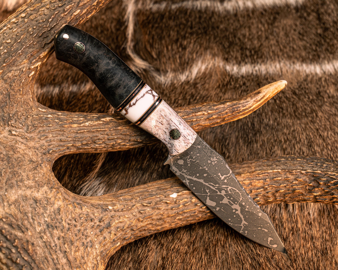 Field Knife Jr- CO Elk Antler, Coyote G10, Black G10 and Copper Pin Striping, White with Copper Matrix Tru-stone Split, Dyed Redwood, Mosaic Pins, 1/8" Copper Pin, Textured Grip