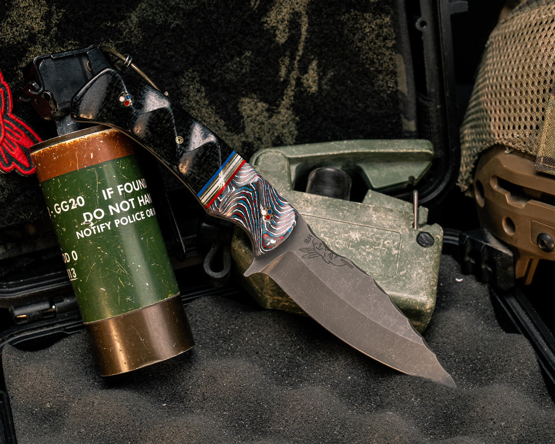 Ishi- Nebula FAT Carbon, Red G10, Brass, White G10 and Blue G10 Split, Black Burlap Micarta, Patriot Mosaic Pins, 1/8" Mosaic Pin, Textured Grip