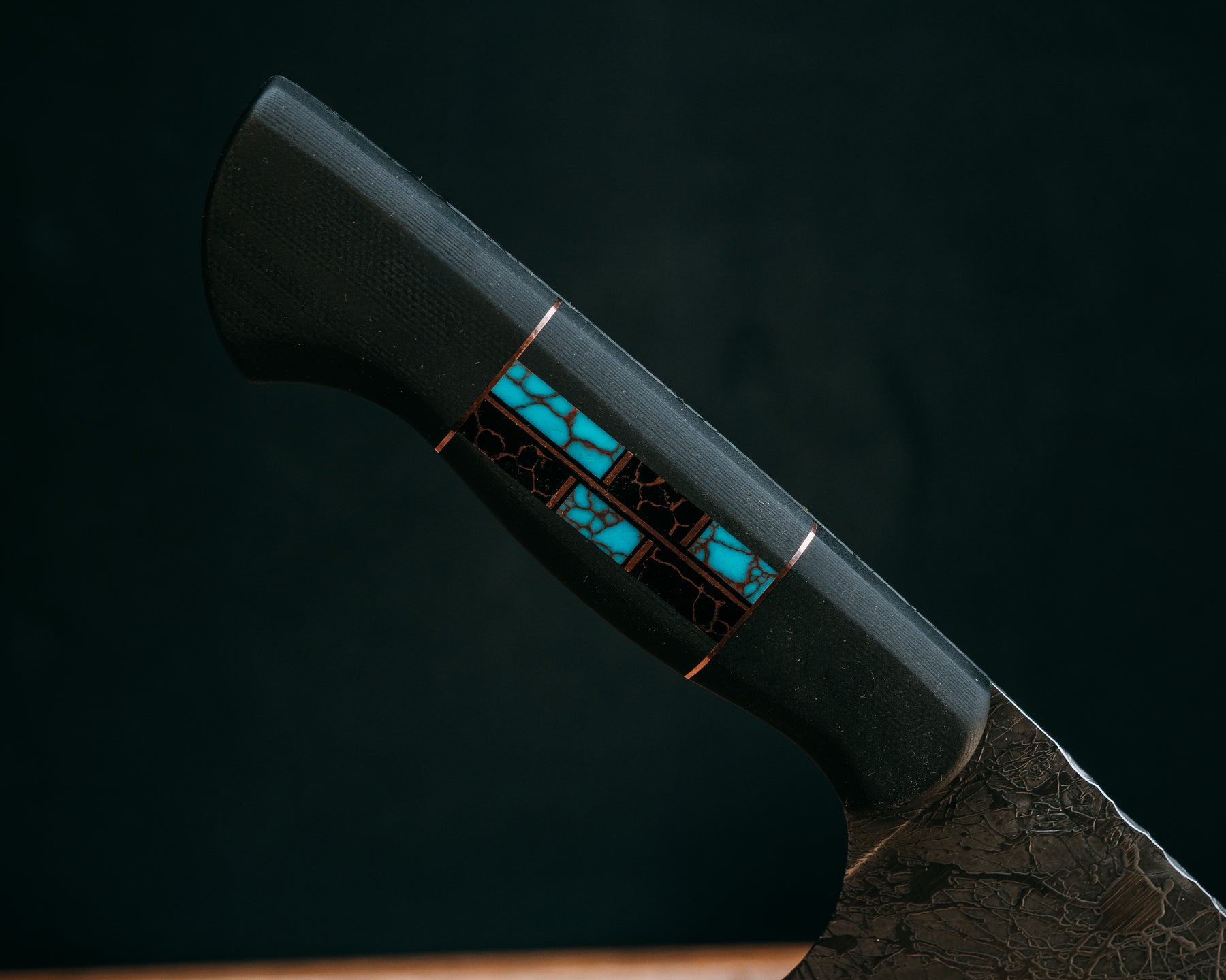 Chef Blade- Black G10, Copper and Black G10 Pin Striping, Black with Copper Web Tru-stone and Turquoise with Copper Web Tru-stone Split, CF Pins, Smooth Grip